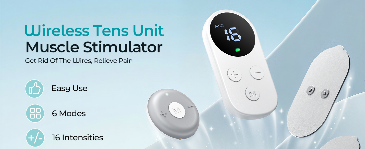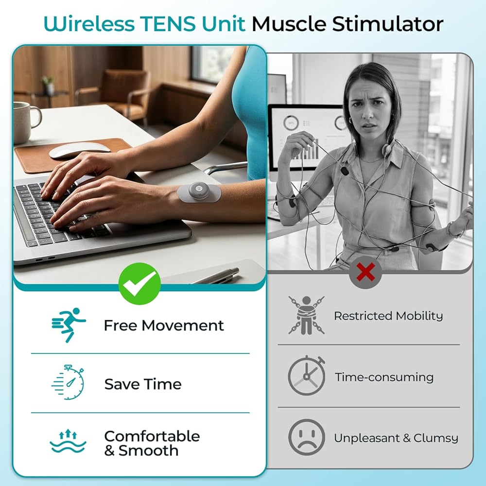 وحدة عشرات لاسلكية - تحرك بحرية دون قيود - اقطع الحبال واستمتع بالحرية المطلقة! يتيح لك محفز العضلات اللاسلكي الخاص بنا لعلاج تخفيف الألم التحرك بحرية أثناء الحصول على علاج لتخفيف الألم. على عكس الأجهزة السلكية التقليدية، تعمل آلة العشرات المحمولة هذه بسلاسة أثناء العمل المكتبي أو ممارسة الرياضة أو الاسترخاء. يتناسب التصميم المدمج مع جيبك، مما يجعله مثاليًا لأنماط الحياة المزدحمة
