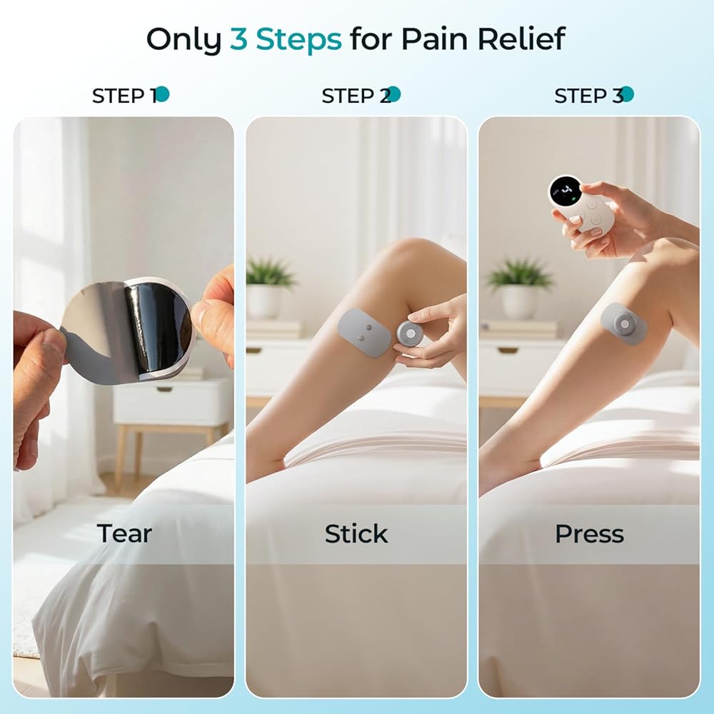 تشغيل سهل في 3 خطوات - تمزيق، لصق، ضغط - لم يكن الحصول على الراحة أسهل من أي وقت مضى! فقط 3 خطوات سهلة: قم بتمزيق الطبقة الواقية، ثم قم بلصق الوسادات على المناطق المستهدفة، ثم اضغط على زر التشغيل. لا يتطلب أي إعداد معقد. مثالي لكبار السن والعاملين في المكاتب وعشاق اللياقة البدنية وأي شخص يبحث عن تخفيف فوري للألم