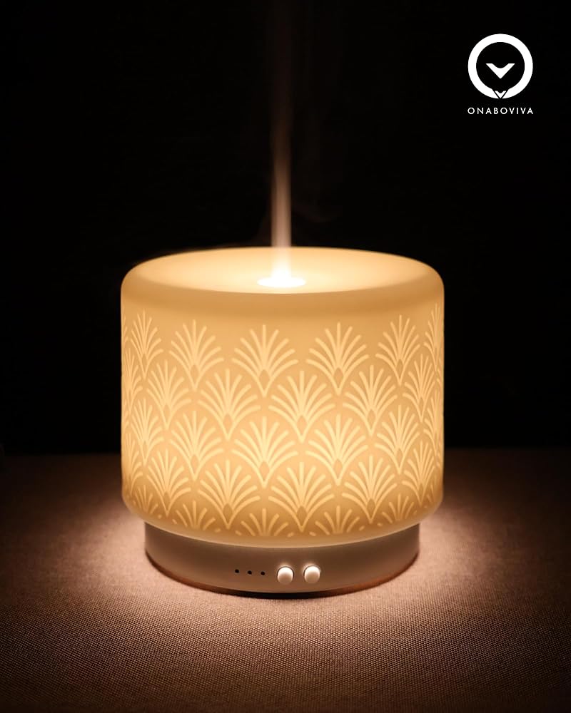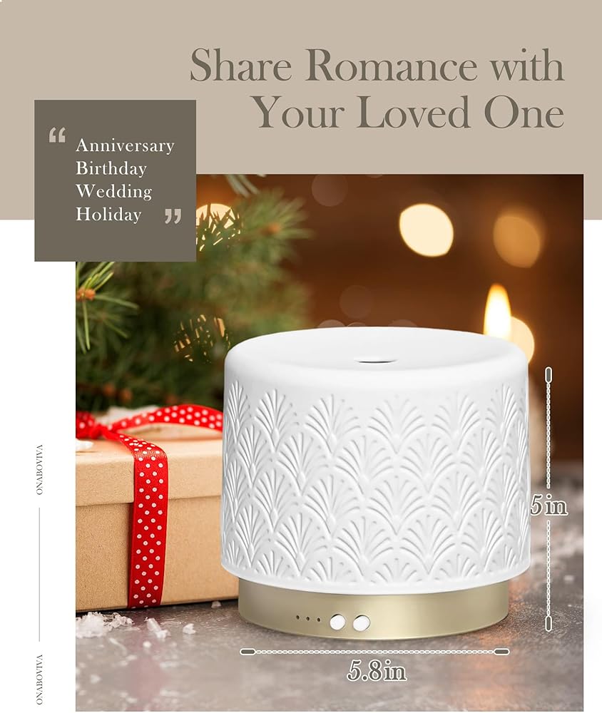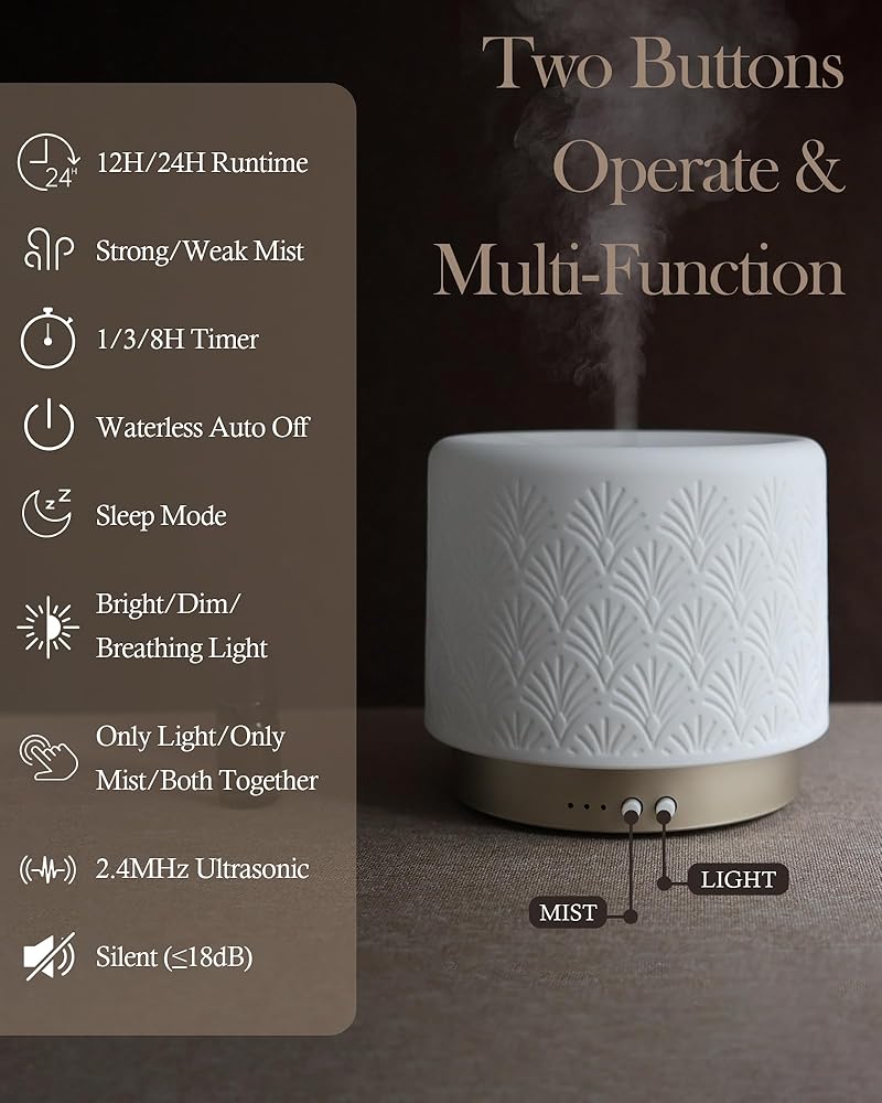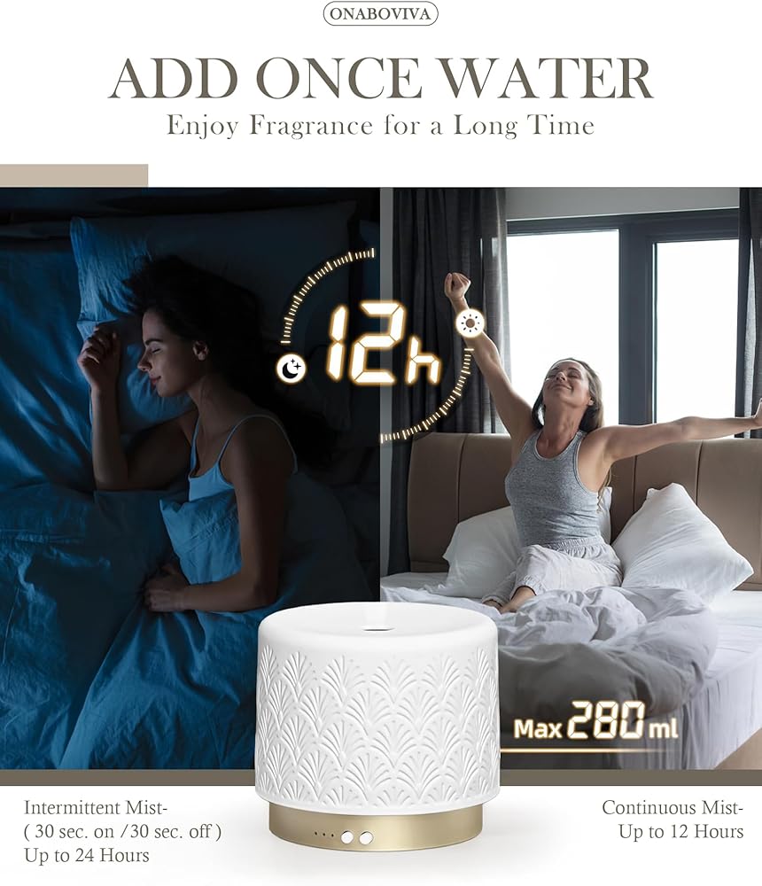 موزع روائح الزيوت العطرية من السيراميك، 280 مل 2.4 ميجاهرتز، موزع روائح العلاج العطري بالموجات فوق الصوتية مع وقت تشغيل 12 ساعة/24 ساعة، إيقاف تلقائي، تشغيل هادئ، 3 إعدادات مؤقت للغرفة الكبيرة، المنزل، المكتب، المنتجعات الصحية، اليوغا، الهدايا