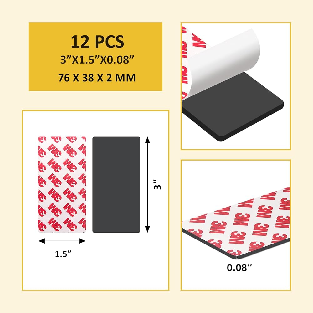 High-Quality Magnetic Tape: This 12-pack includes flexible magnetic strips made from durable materials, ensuring long-lasting use for various DIY projects and crafts. Strong Adhesive Backing: Each strip features a powerful adhesive backing, providing a secure and reliable hold on multiple surfaces without the need for additional glue. Perfect Size for DIY Projects: Measuring 3" x 1.5" x 0.08" (76x38x2mm), these rectangular magnet strips are ideal for a wide range of crafting and DIY applications. Versatile Use: Suitable for use in home, office, or school projects, these magnetic strips can be used for organizing tools, creating custom magnets, or enhancing your craft creations. Easy to Cut and Customize: The flexible design allows you to easily cut the magnetic tape to your desired size, making it adaptable to any project requirement. Durable and Reusable: Made from high-quality materials, these magnetic strips are durable and can be reused multiple times, offering great value for your money. Convenient 12-Pack: With 12 pieces in each pack, you'll have plenty of magnetic strips to complete multiple projects or share with friends and family. Wide Range of Applications: Perfect for use on whiteboards, refrigerators, metal surfaces, and more, these magnetic strips are a versatile addition to your crafting supplies.