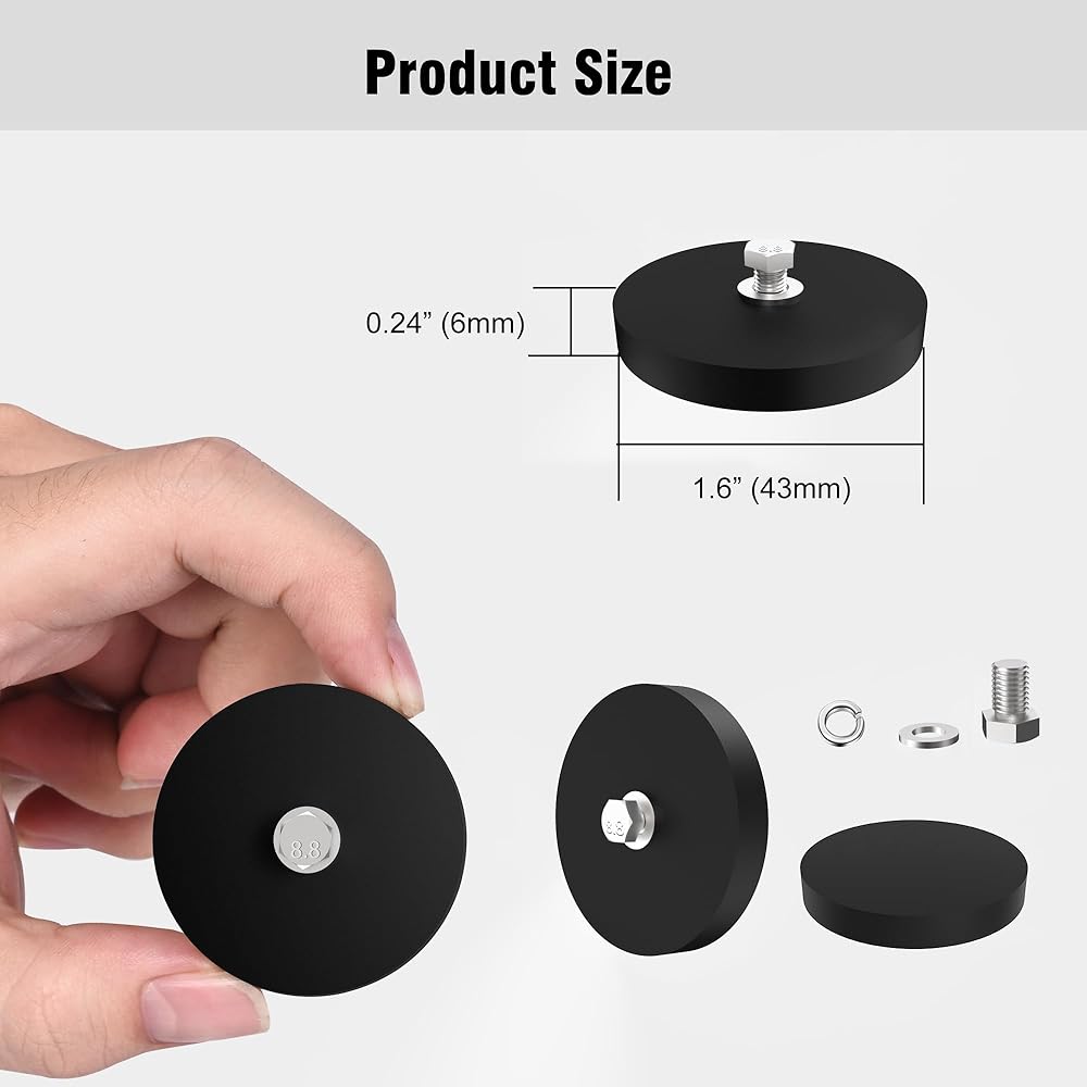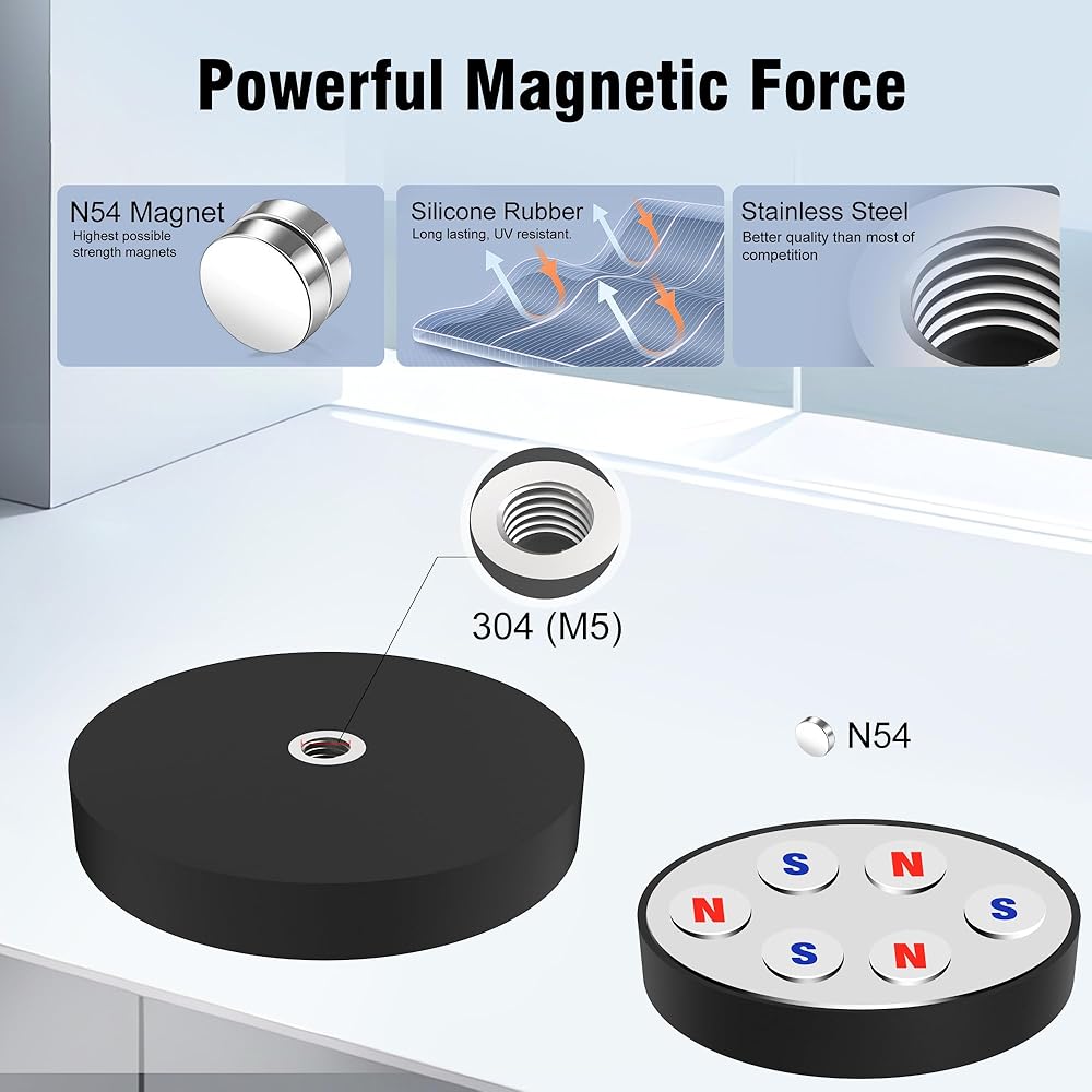 • جاهز للتركيب - يتميز كل مغناطيس قوي بفتحة M5 مدمجة مصنوعة من الفولاذ المقاوم للصدأ 304 المقاوم للصدأ. لتبدأ على الفور، قمنا بتضمين مسامير وغسالات متطابقة من الفولاذ المقاوم للصدأ، مما يجعل من السهل ربط الخطافات والأقواس والأضواء والمزيد.