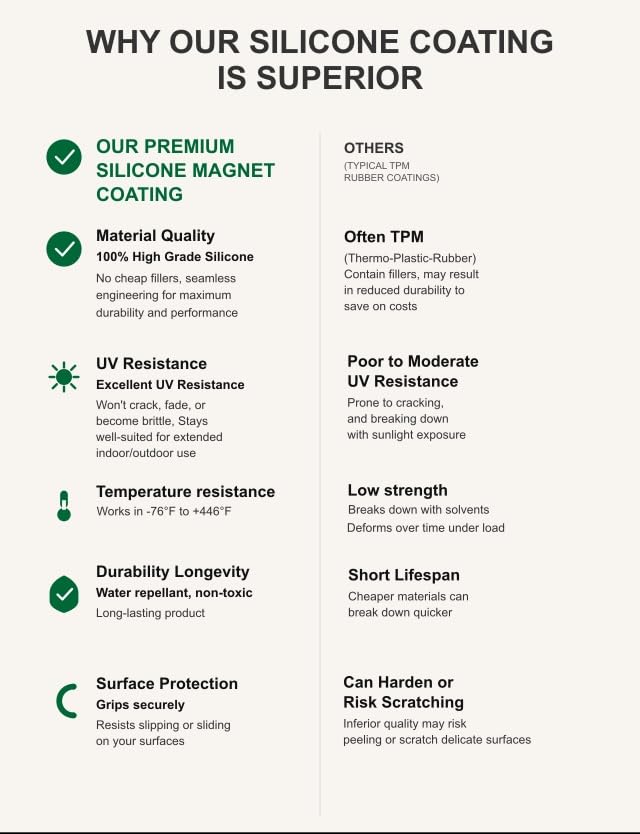 • طلاء سيليكون مقاوم للخدش - طلاء مطاط السيليكون الناعم والمتين يغلف المغناطيس بالكامل. وهذا يخلق حاجزًا وقائيًا يمنع الخدوش على الطلاء أو الكروم أو الأسطح الحساسة الأخرى مع توفير قبضة ممتازة أيضًا.
