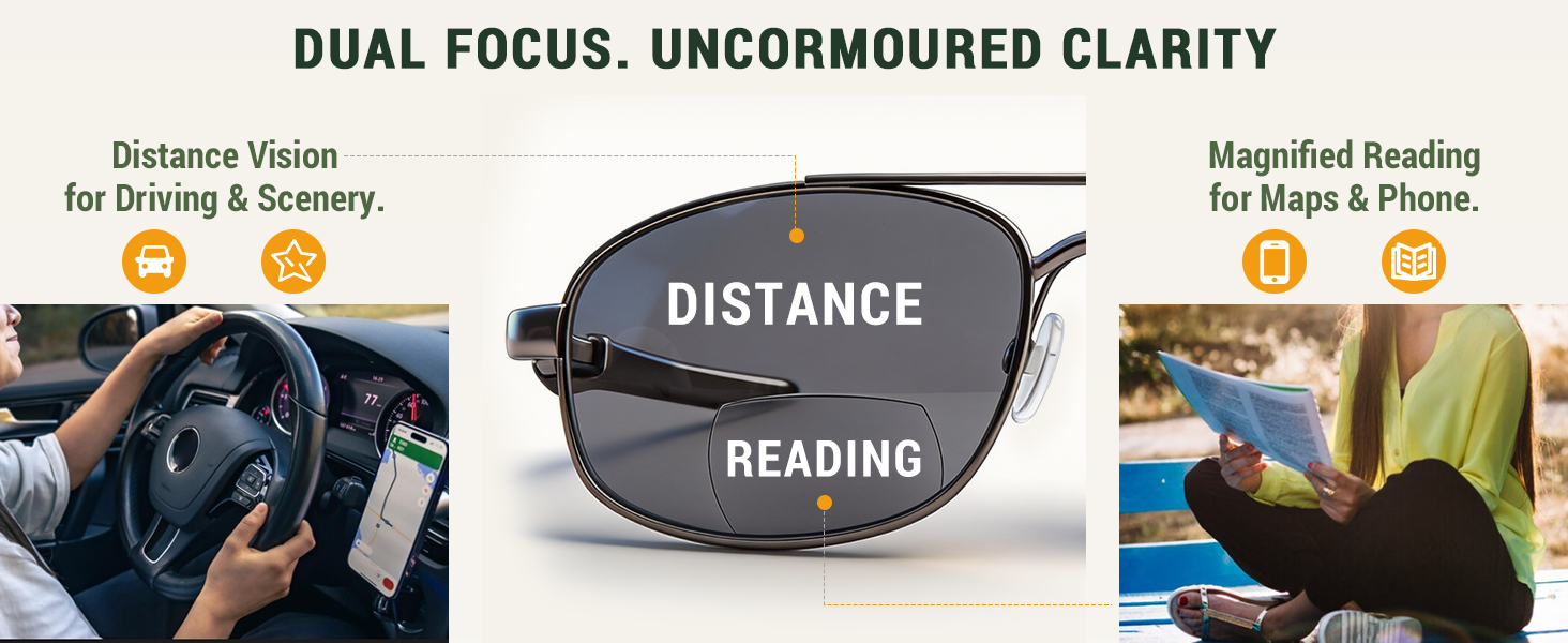 Designed to block sunlight & blue light without obstructing vision. Nano coating reduces glare, ideal for outdoor reading & distance viewing. CP frame fits all faces, easy to use bifocal area for reading or close-up vision.