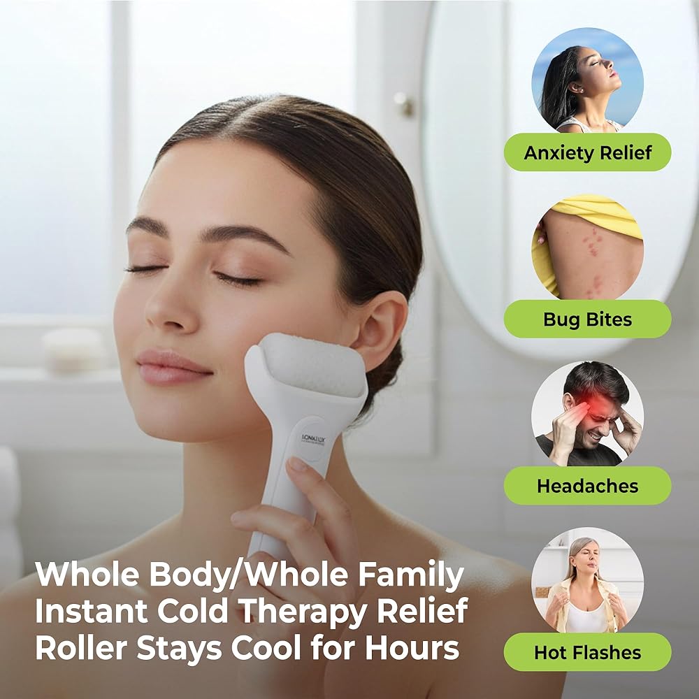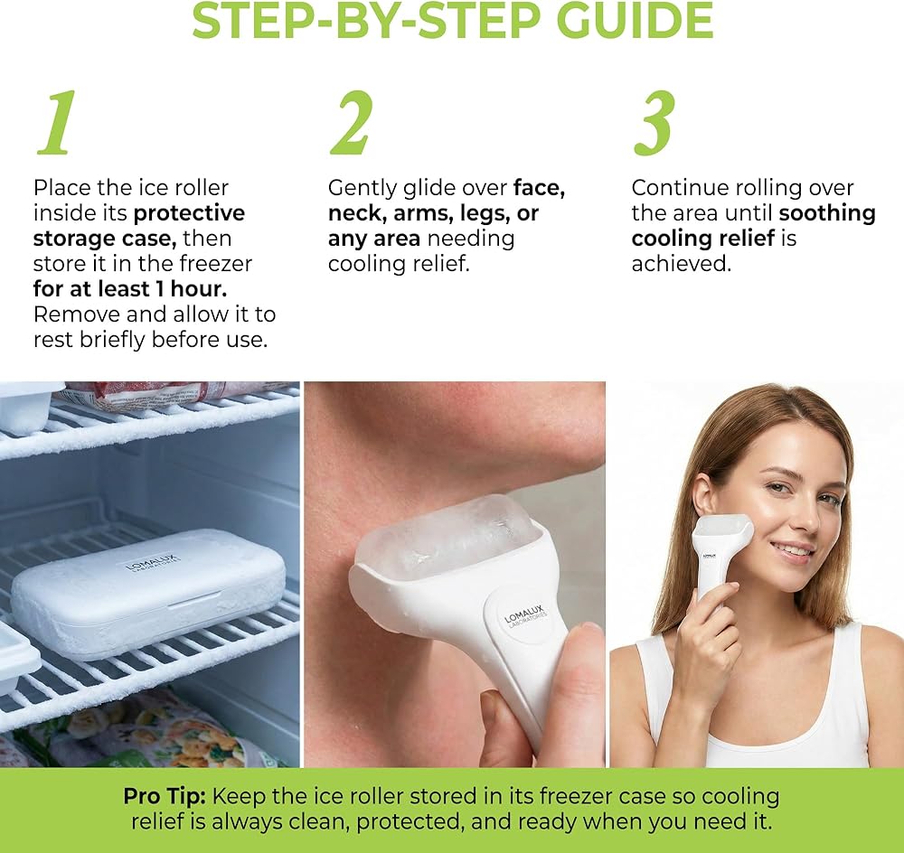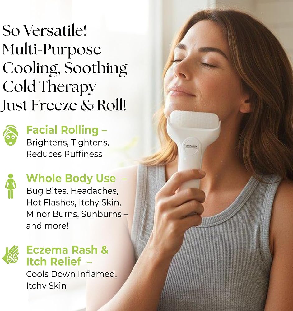 تخفيف فوري لتبريد الوجه والجسم: استمتع بتخفيف سريع المفعول من حكة الجلد والتهيج والانزعاج الناجم عن الأكزيما والحروق الطفيفة وحروق الشمس. فهو يعزز الدورة الدموية للحصول على توهج صحي، ويشد، ويفتح، ويقلل من انتفاخ الوجه. توفر أداة Loma Lux Ice Roller إحساسًا مهدئًا يهدئ البشرة في لحظات.