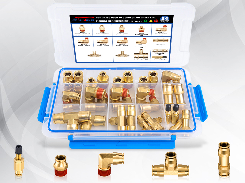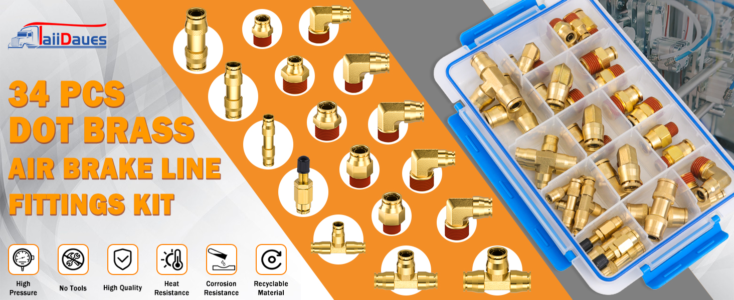 مادة فاخرة - مجموعة تركيبات الهواء الخاصة بنا مصنوعة من نحاس CA360 عالي الجودة، وتلبي معايير D.O.T. FMVSS 571.106، SAE J1131 مع مقاومة للتآكل، ليونة في درجات الحرارة العالية ونفاذية منخفضة. وقت خدمة طويل، نوع تشكيلة تركيبات فرامل الهواء: 1/4 بوصة، 3/8 بوصة، 1/2 بوصة