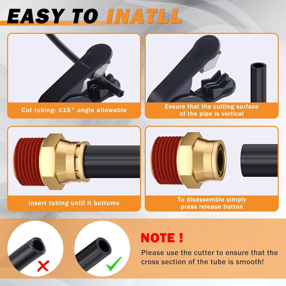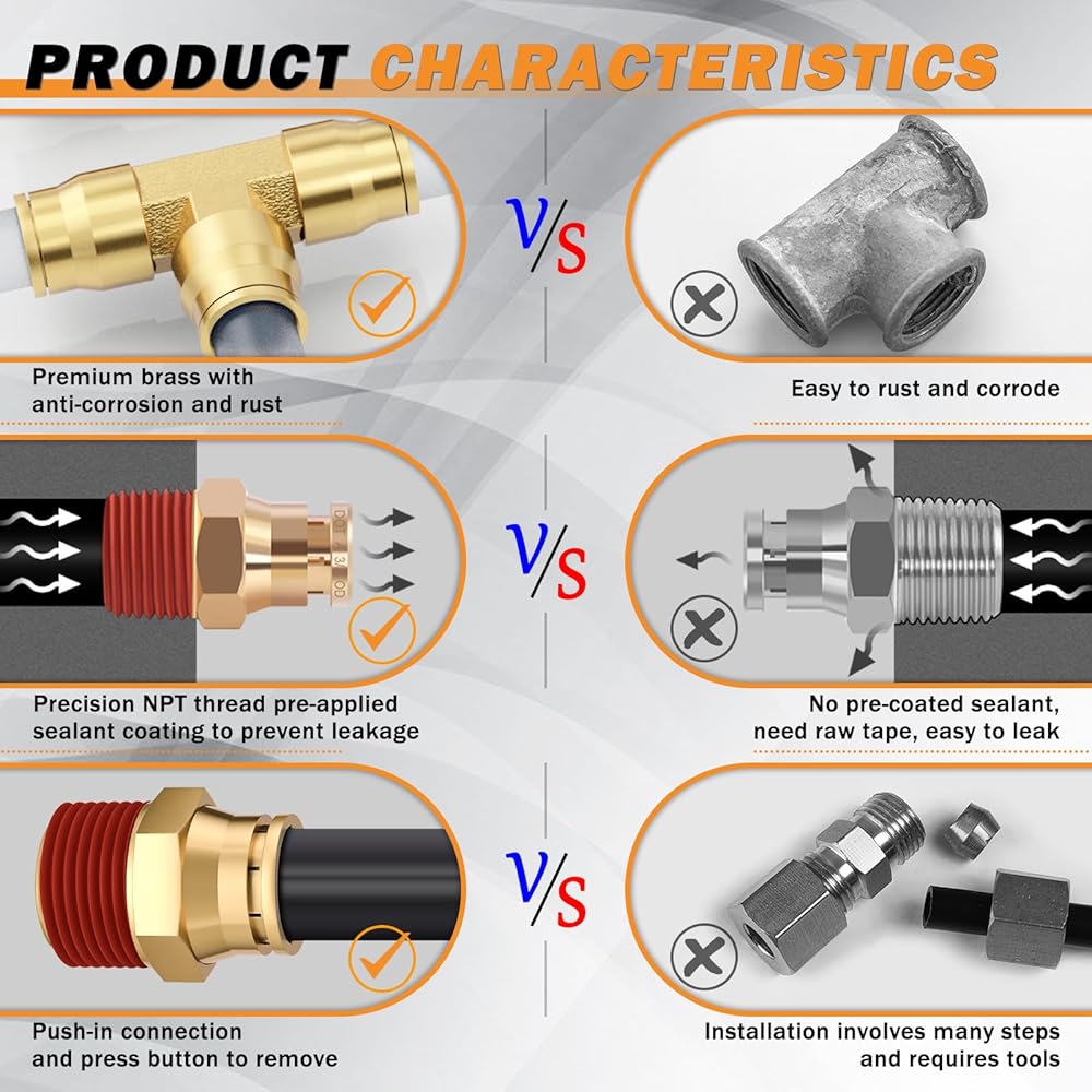 سهل التركيب - الخيط الذكري الدقيق هو مادة مانعة للتسرب حمراء تم تطبيقها مسبقًا من أجل إغلاق أفضل. يمكن إغلاق جميع تركيبات التوصيل السريع لخطوط الهواء النقطية عن طريق دفع الأنبوب بقوة داخل التركيبات، ما عليك سوى الضغط على الزر لإزالة الأنبوب