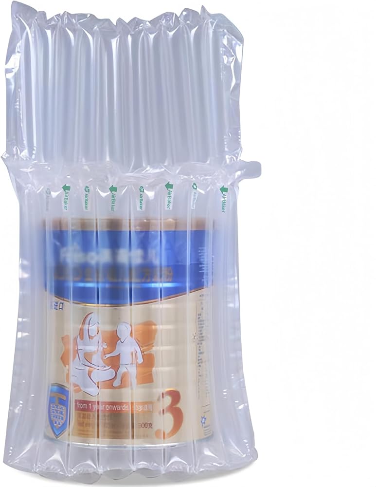air pressure in part of the section. *This air column protective bag is ideal for shipping fragile products such as milk powder. *Product dimension: 330mm x 410mm before inflation *Colour: White / Clear: PA & PE Standard Application: Milk formula can – Can size within 20cm*13cm Each column width is 3cm, you can inflate the bag via hand pump ( included) or air compressor. *Suitable for protecting container of