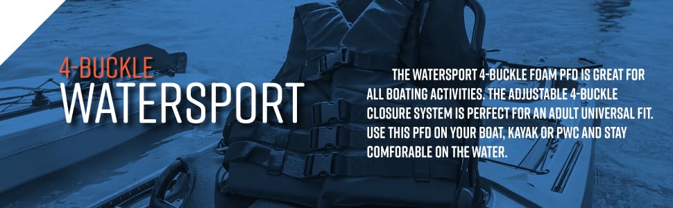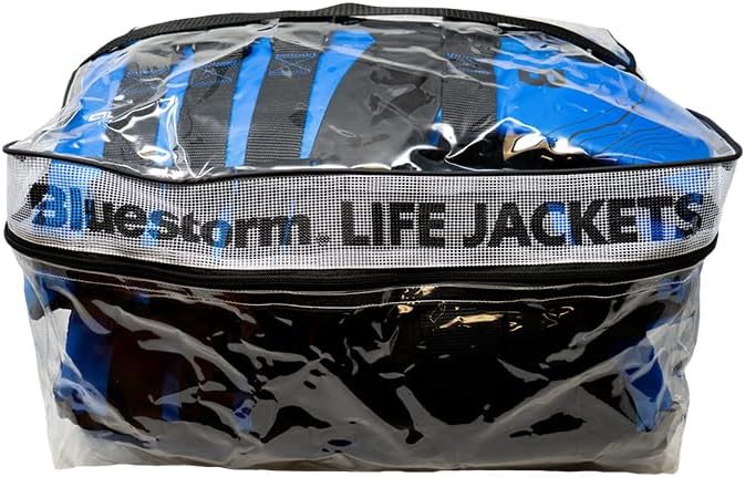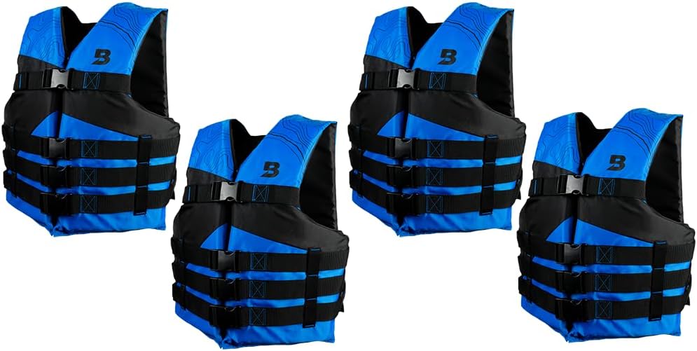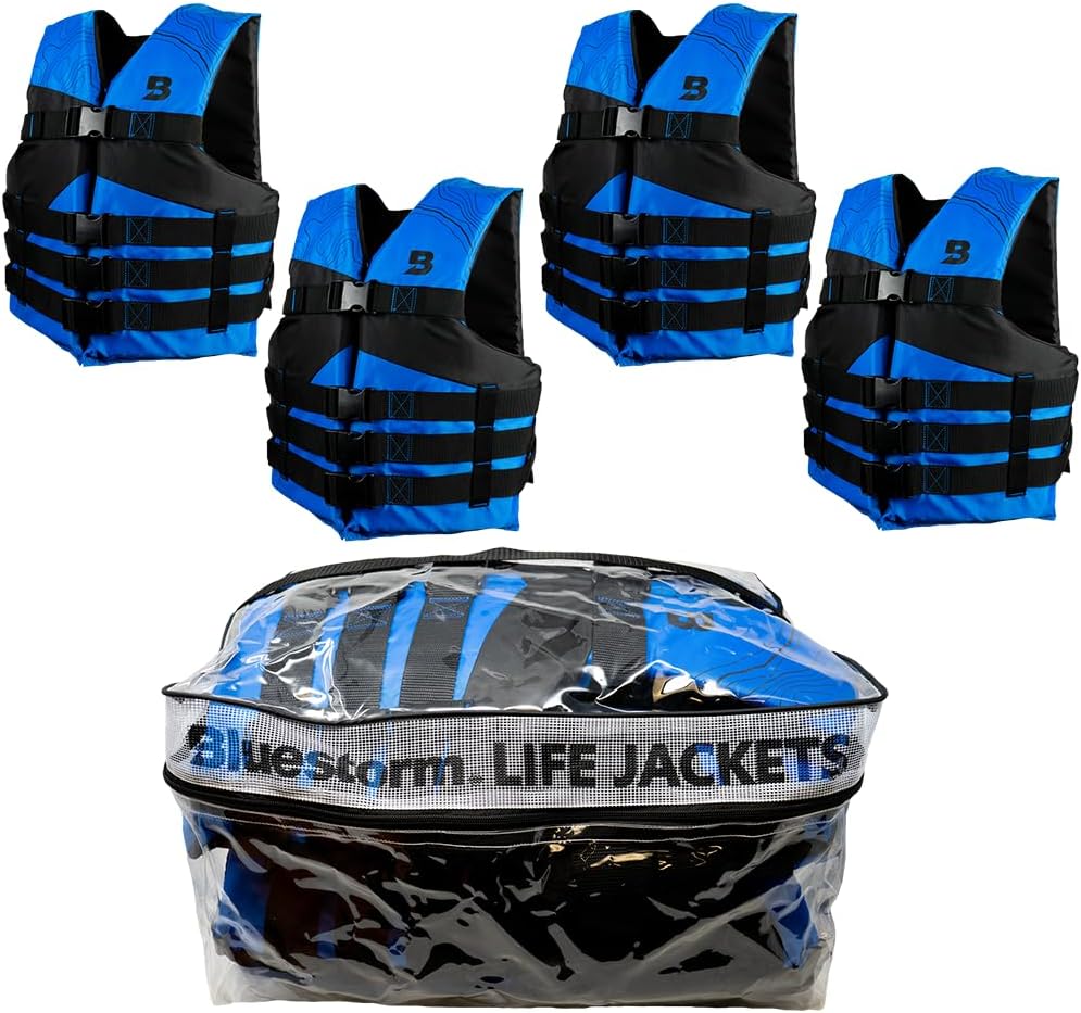سترة نجاة للقوارب العامة للرياضات المائية ذات 4 إبزيم من Bluestorm® للبالغين | سترة نجاة من الإسفنج العالمي معتمدة من خفر السواحل الأمريكي (USCG) من النوع 3 (PFD)، 4 قطع باللون الأزرق مع حقيبة، عالمية للبالغين