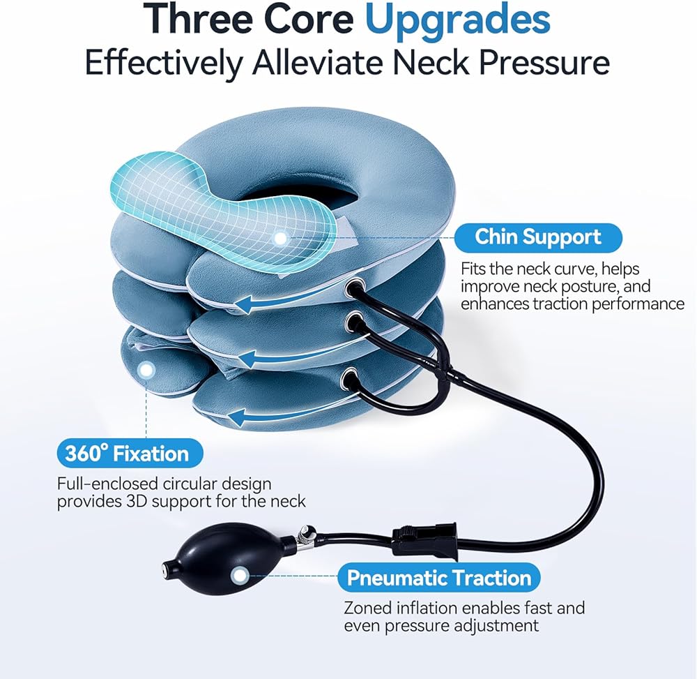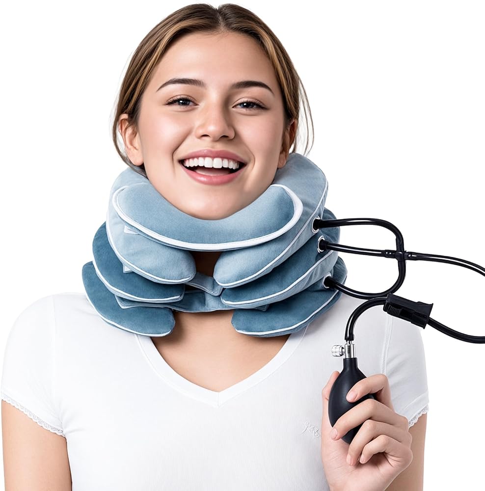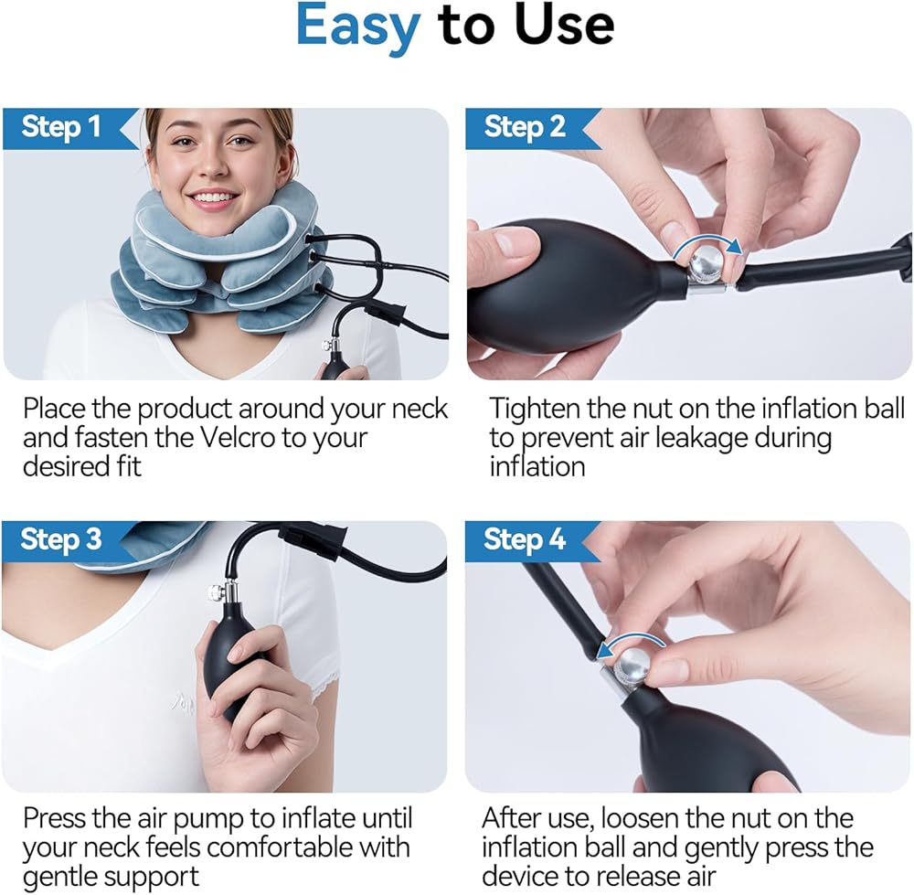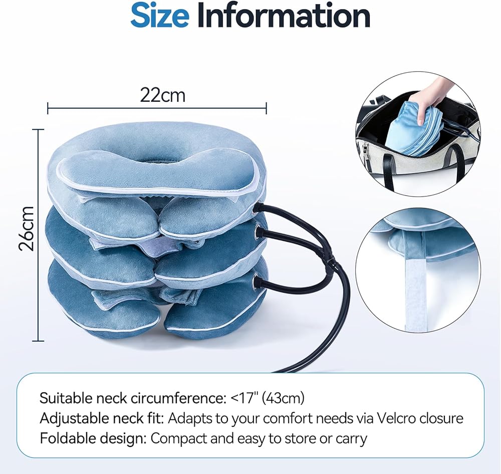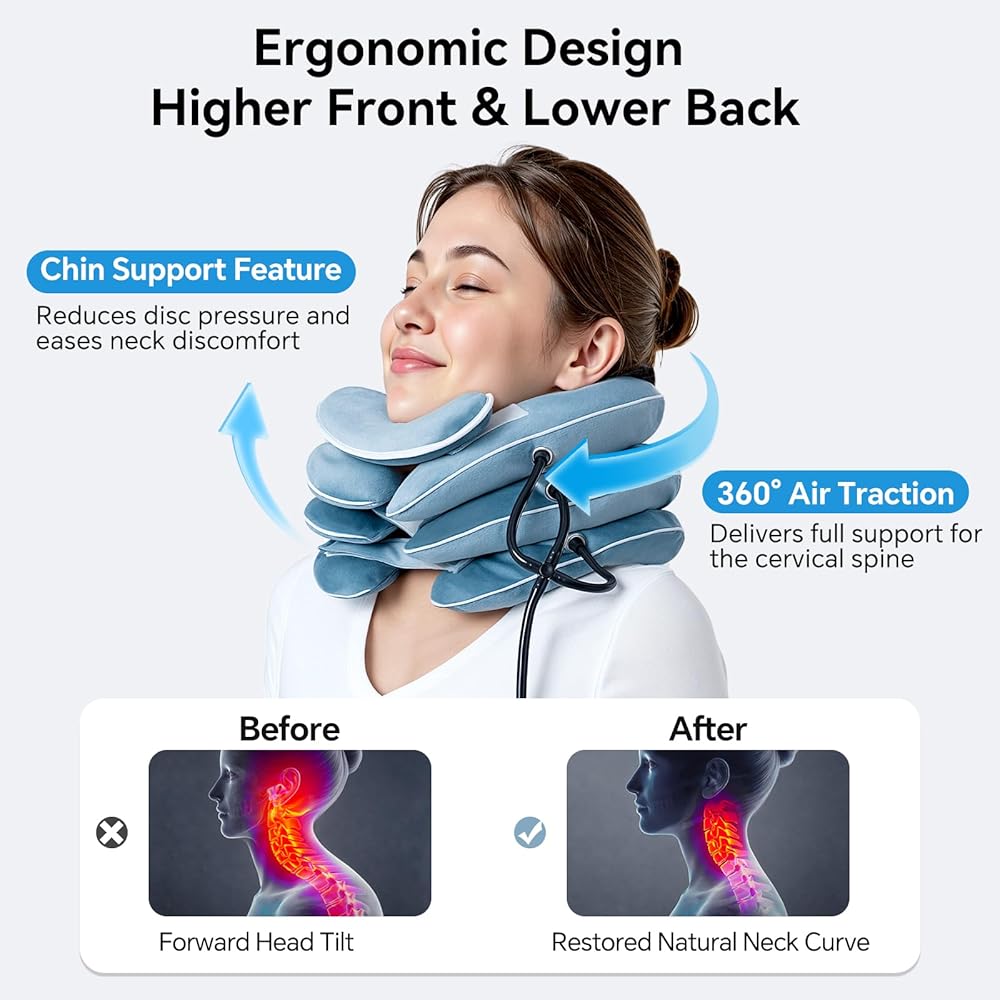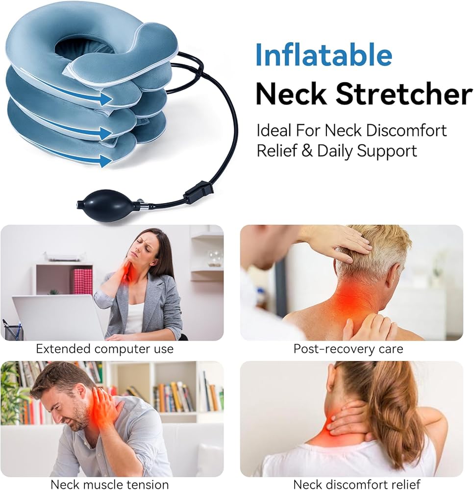 جهاز جر الرقبة القابل للنفخ والقابل للتعديل: يمكن لممتد الرقبة هذا ضبط حجم النفخ بمرونة لضمان الدعم المناسب للرقبة. يخفف آلام الرقبة، والتصلب، وتوتر العضلات، والتعب الناتج عن العمل لفترات طويلة