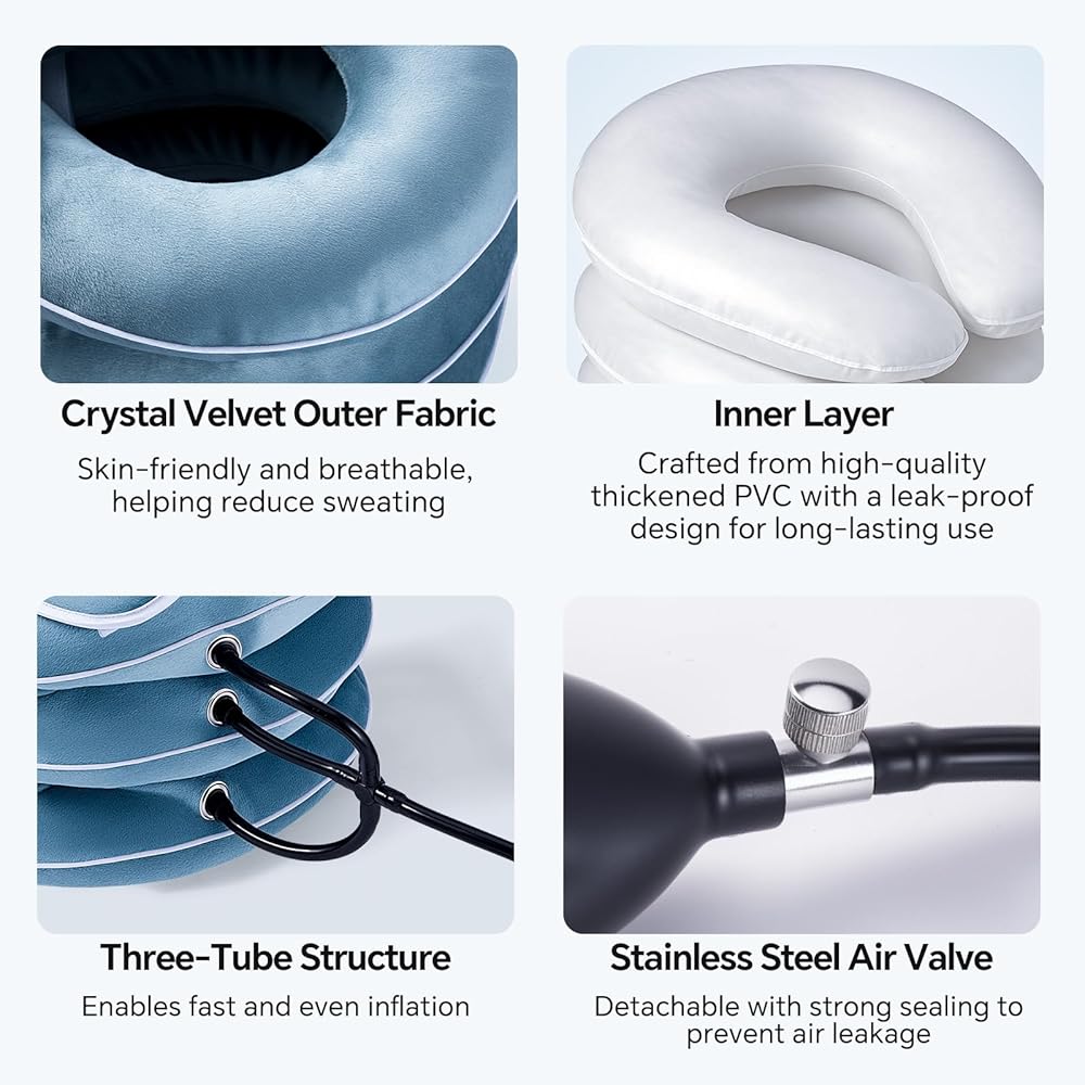نسيج تقني مطور: يتميز جهاز جر الرقبة هذا بطبقة داخلية سميكة من البولي فينيل كلوريد وأنبوب هواء، مما يمنع تسرب الهواء بشكل فعال ويضمن المتانة. القماش المخملي الكريستالي ناعم وصديق للبشرة وعديم الرائحة وسهل التنظيف، مما يوفر تجربة مريحة في كل مرة تستخدمه.