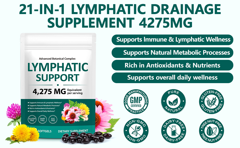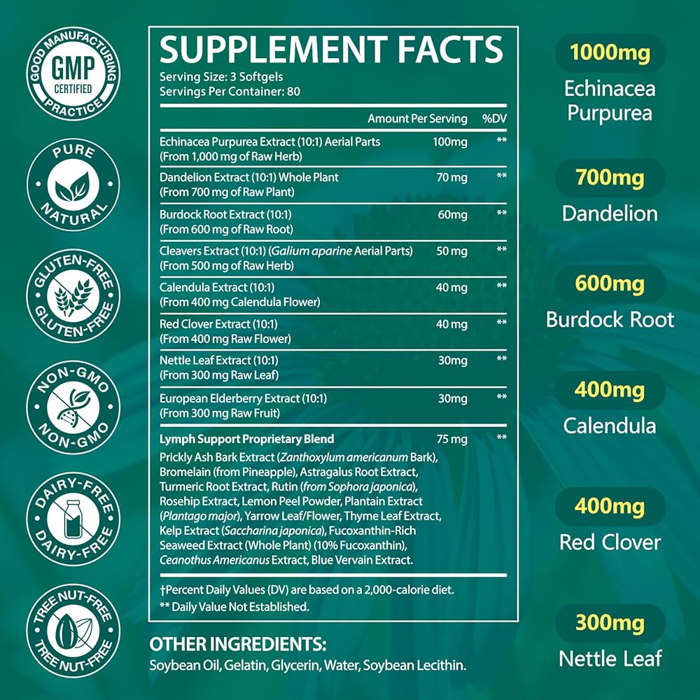 تركيبة الدعم اللمفاوي 21 في 1: توفر مكملات الدعم اللمفاوي 4,275 مجم من المعادل العشبي لكل وجبة مع مزيج قوي من الإشنسا، وجذور الهندباء، وجذور الأرقطيون، والبرسيم الأحمر، وأوراق نبات القراص، والتوت. توفر هذه التركيبة المركزة دعمًا عشبيًا قويًا لتغذية جسمك والحفاظ على الصحة العامة