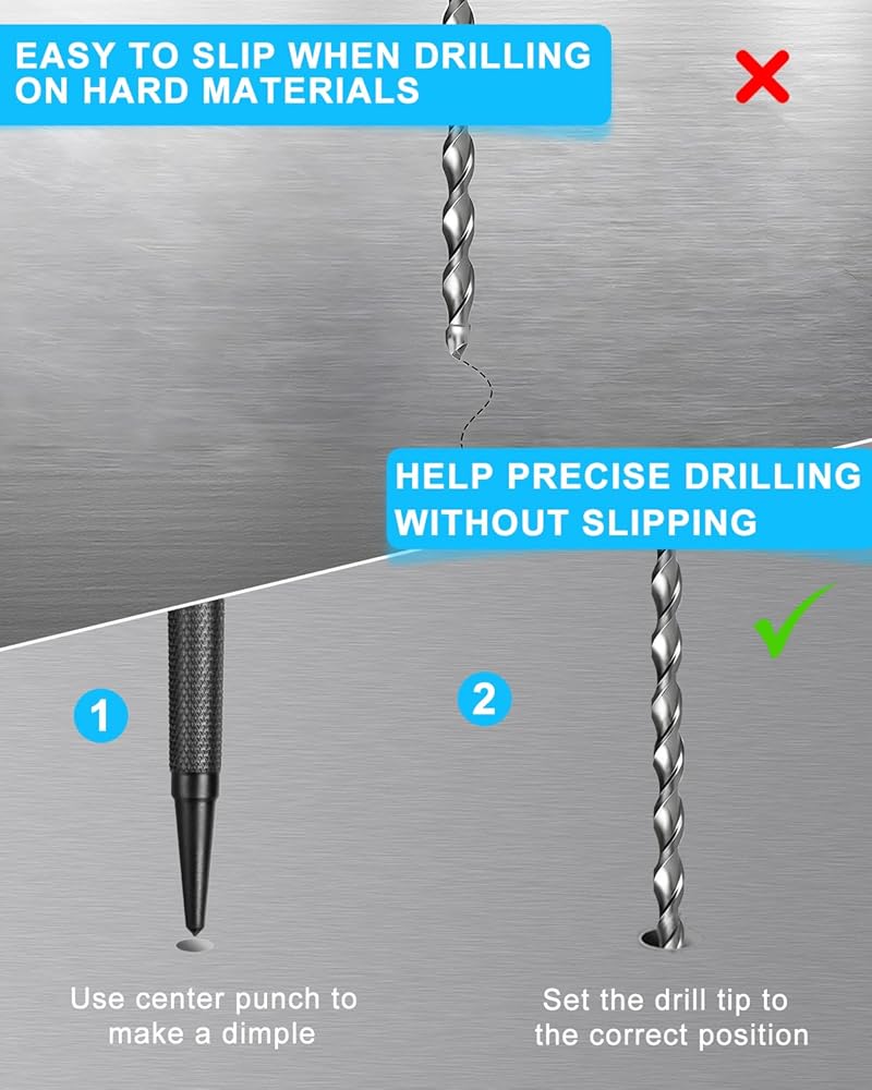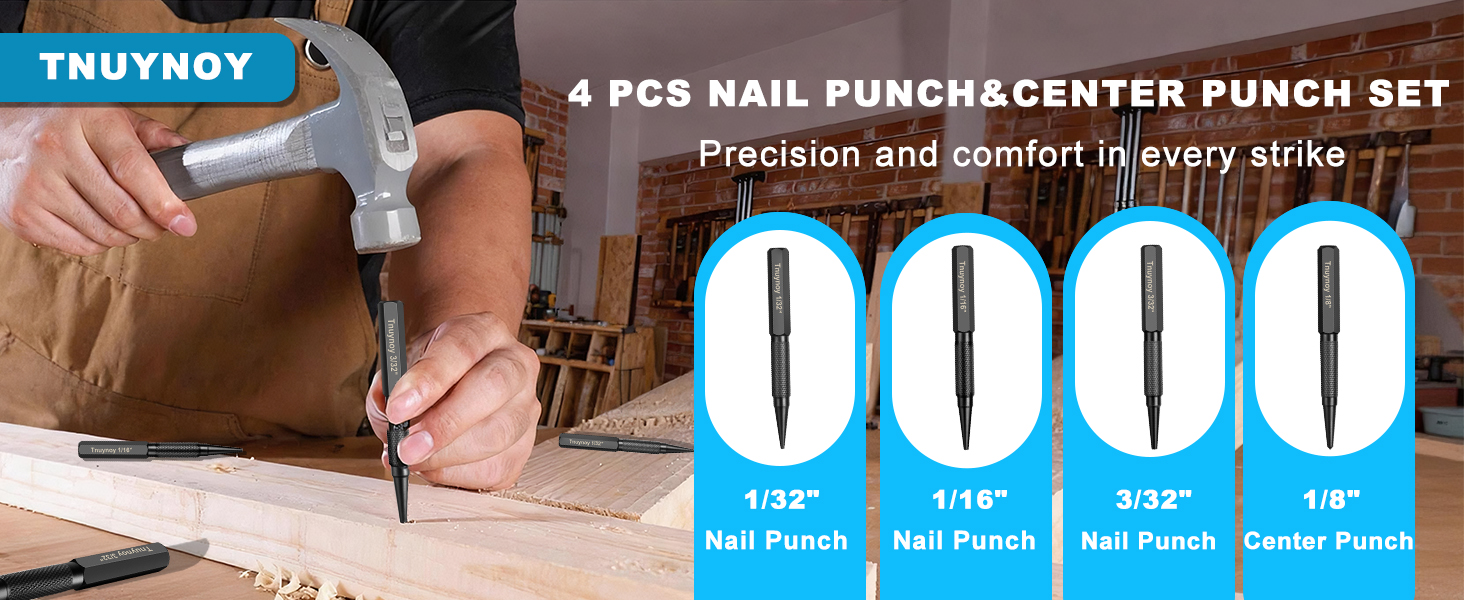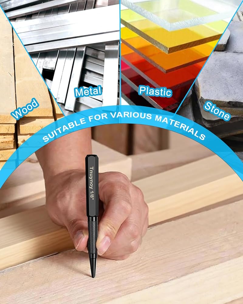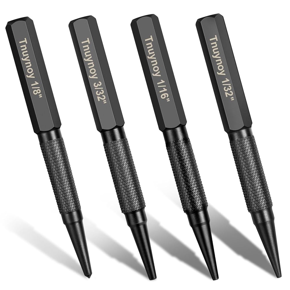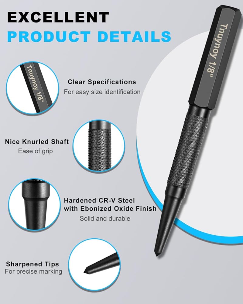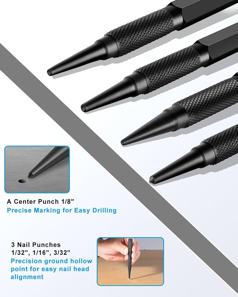 عمل فعال: تتفوق لكمات الأظافر لدينا في دفع الأظافر بدقة إلى المواد الخشبية، مما يسمح لك بالحصول على لمسة نهائية ناعمة واحترافية. يمكن استخدام المثقاب المركزي لوضع علامات دقيقة لبدء التدريبات.