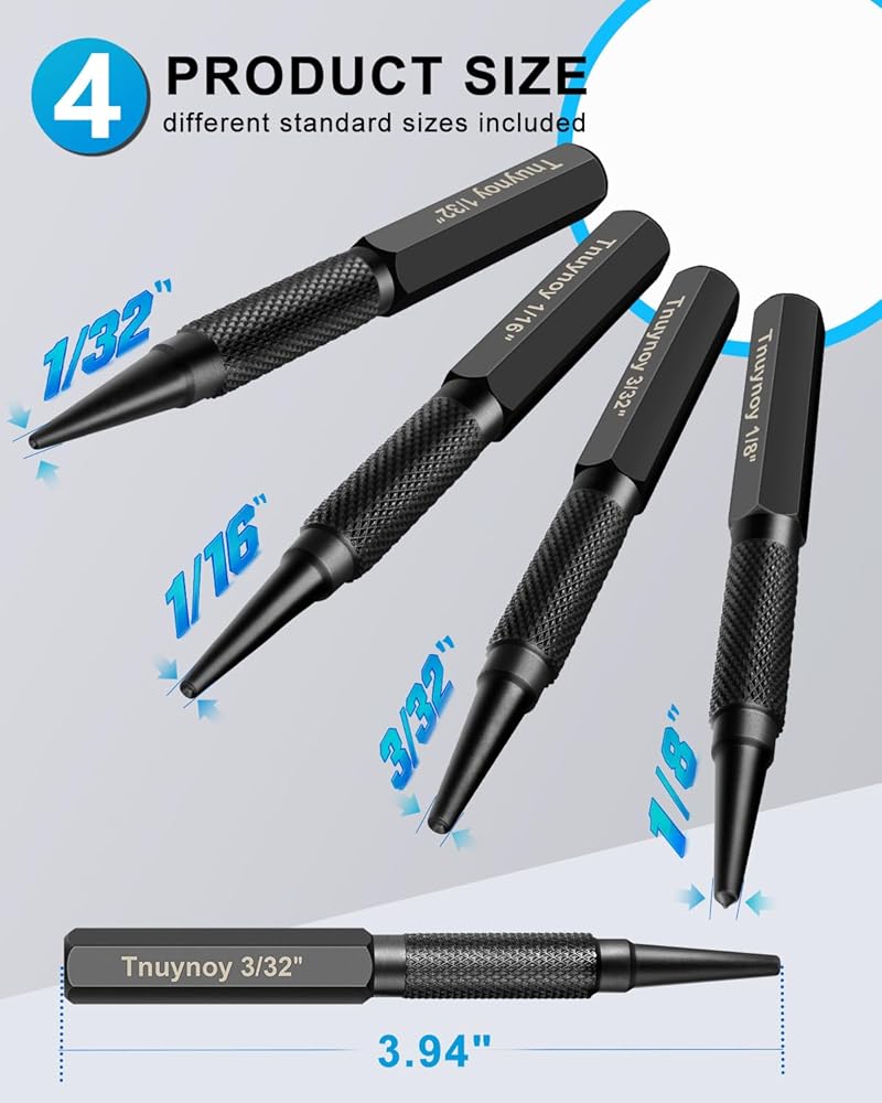 مجموعة اللكمات الشاملة: تتضمن مجموعة أدوات اللكم هذه 4 مقاسات قياسية مختلفة، 1/32 بوصة، 1/16 بوصة، 3/32 بوصة أداة تثبيت الأظافر و1/8 بوصة ثقب مركزي؛ يتم وضع علامة واضحة على الأحجام على كل واحدة وسهلة القراءة؛ توفير الجودة والراحة لعشاق الأعمال الخشبية والنجارين ومحترفي الأعمال اليدوية على حدٍ سواء.