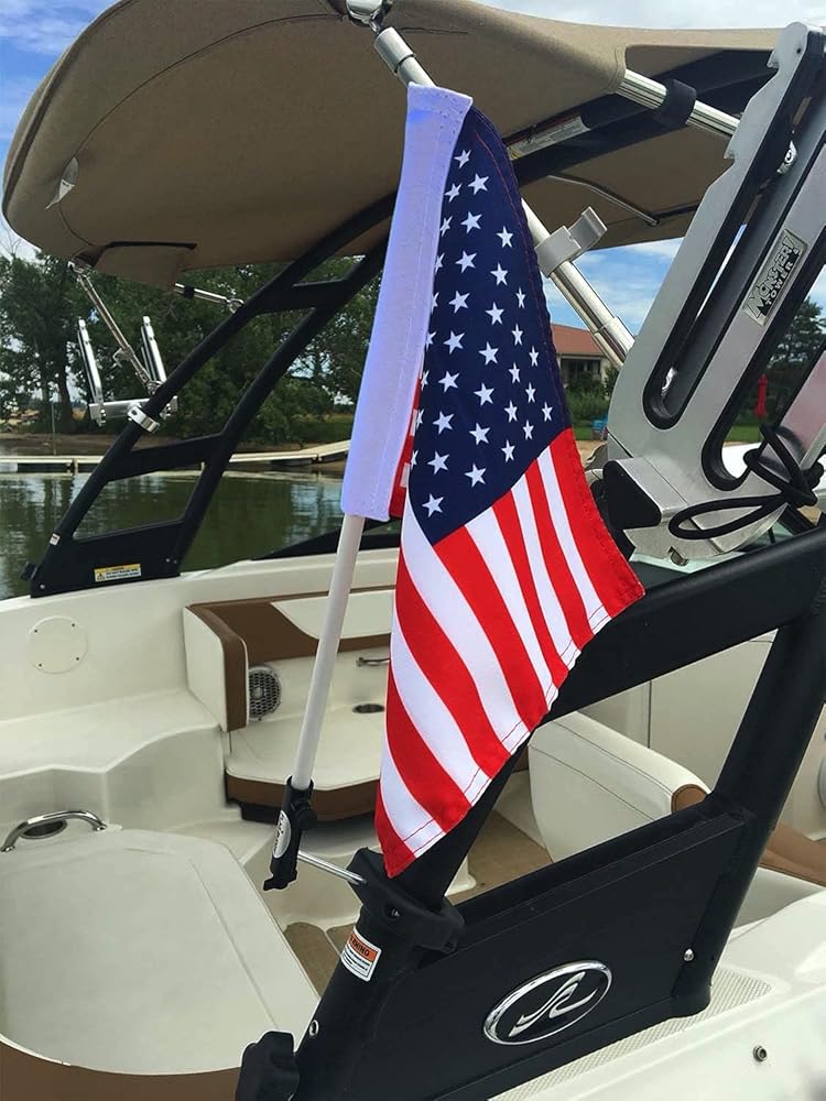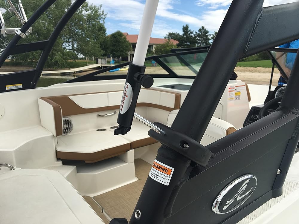 Are you looking for a flag mount for your boat tower? This easy to use Flag mount allows you to fly an American Flag High and Proud. Just Clamp the Flag Buddy to your boat, it also rotes up and down if you want it to. That's it! (FYI- you can lock it up if you want to. Good up to 40mph.) Key features: Clamps around Wakeboard Towers with 2 Stainless steel screw. (No holes) Rotates 360 degrees. Won't fall off like the suction cups. Has tension adjustment. (How easy the flag rotates) Stainless steel screws (won't rust) Mounts to: Wakeboard Towers from 1.6 inchs up to 2.5 inch Dia. NOTE: Does not fit the new Wakesetters It's “hands free” No need to remove the flag from the holder. It swings down out of the wind, (No Flapping Noise) Buy Today and get a Free American Flag with your Mount!!!