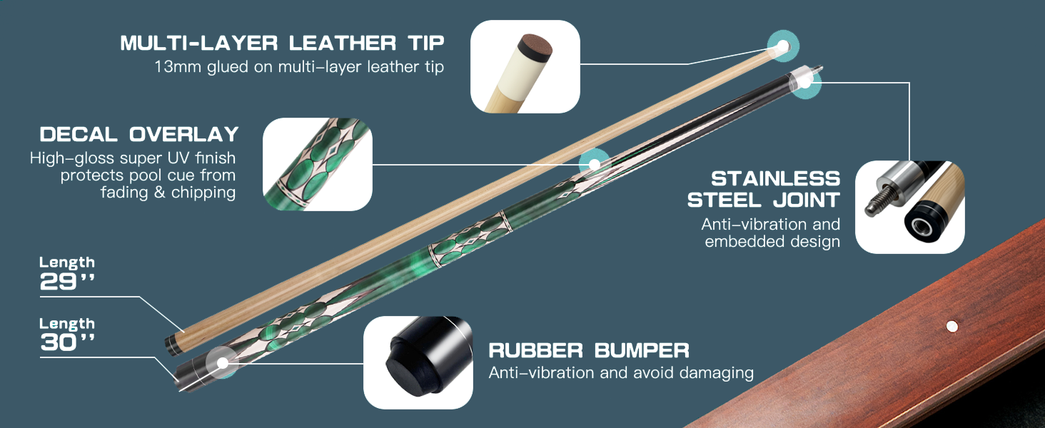 • ✨ Elite Canadian Maple Durability - Pool sticks hand selected premium maple shaft resists warping. Nine-layer gloss varnish shields against moisture and fading. Combines lightweight strength with pro grade resilience for long term stability and reliable gameplay.