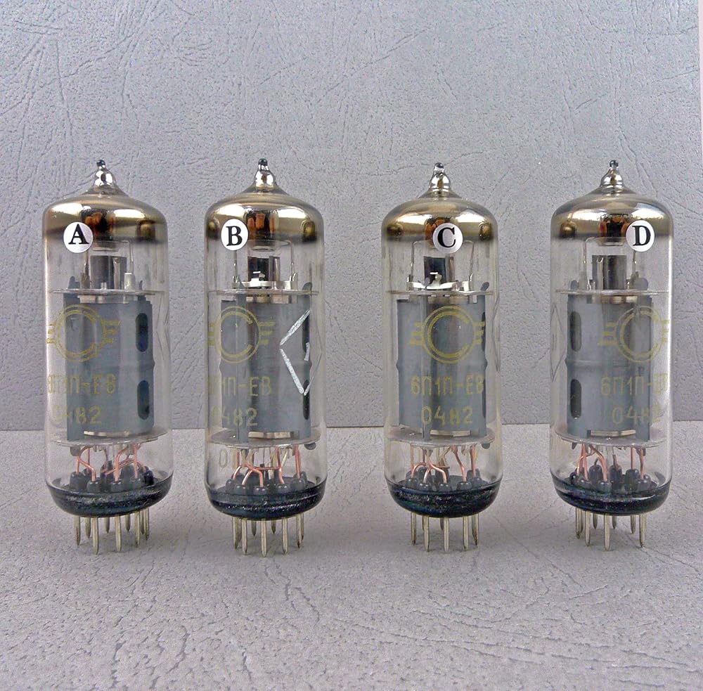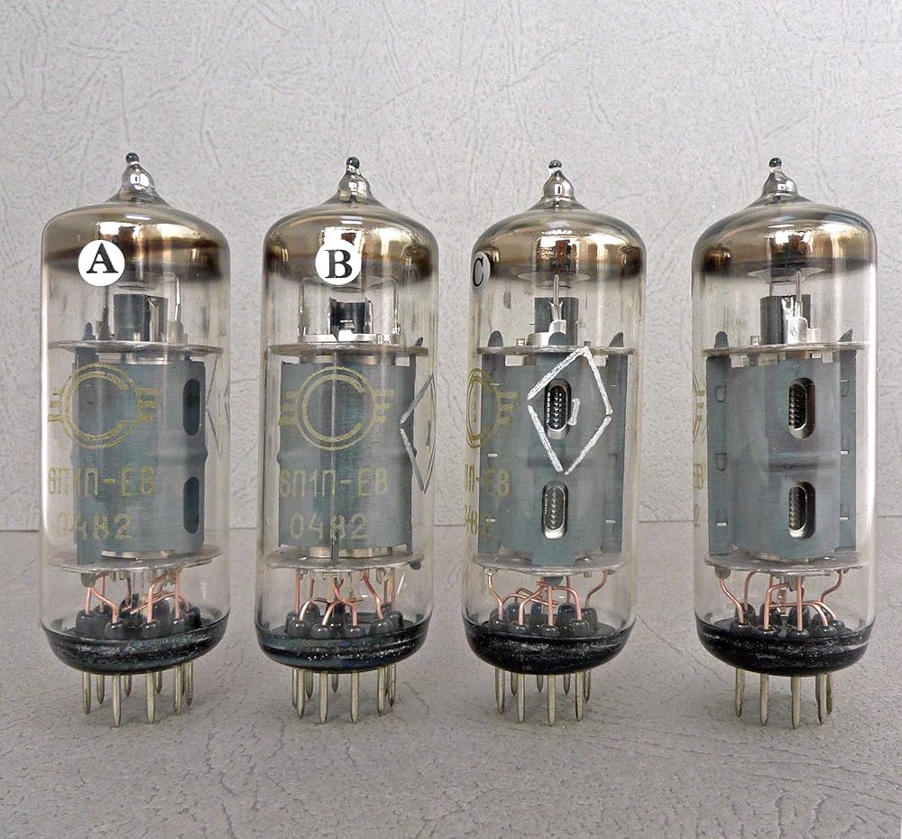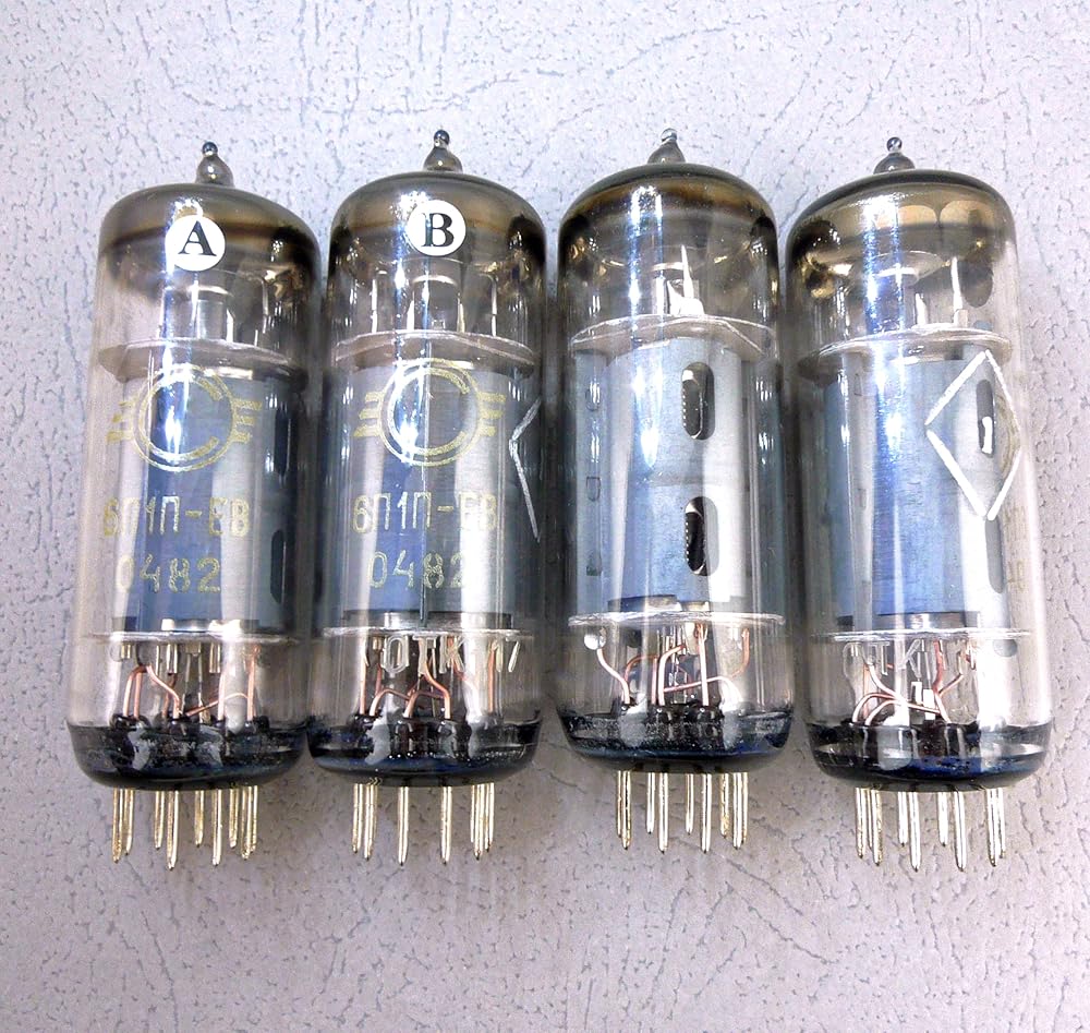 Matched Quad (4 pcs) 6P1P-EV (6П1П-EB) NOS Vacuum Tubes. The 6P1P-EV vacuum tube is a vintage Soviet-made miniature 9-pin beam-tetrode. The “-EB” designation at the end of the 6P1P tube code designates a long-life (E) and high-reliability (B) version of the 6P1P tube. 6P1P-EV tubes have an average life of 5000 h, compared to 3000 h for 6P1P tubes.