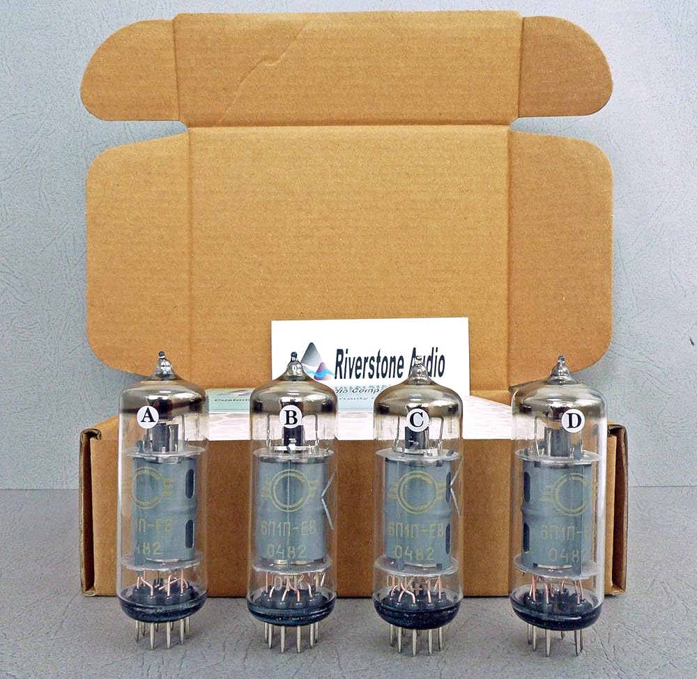 Tested AND Matched Quad 6P1P-EB (6П1П-EB) NOS Vacuum Tubes. These vintage NOS vacuum tubes are an excellent replacement for Chinese 6P1 and Russian 6P1P tubes that are used in amplifer circuits. During parameter testing at our workshop, all tubes are subjected to multiple test cycles and are matched within 3% for both plate current (ip) and mutual conductance (Gm). Fewer than 50% of the NOS 6P1P-EV tubes we test meet our high standards for audio use and are selected for these Platinum Grade Matched-Quads. You will not find a more rigorously tested set of vacuum tubes anywhere. PLEASE NOTE: 6P1P-EV tubes can only be used as a direct replacement for Chinese 6P1 and Russian 6P1P tubes. 6P1P-EV tubes should not be used to replace other types of 9-pin vacuum tubes - AMPLIFIER DAMAGE CAN OCCUR IF YOU SUBSTITUTE THE WRONG TYPE OF TUBE. WARRANTY: we have confidence in our products and guarantee that these tubes will test at NOS levels when received AND we back these tubes with a no-nonsense two-year money-back warranty. To protect the tubes during shipping and storage, 6P1P-EV tubes are supplied in Riverstone Audio's custom "tube cradle" boxes. All vacuum tubes sold by Riverstone Audio will have the "Riverstone Audio" name, logo and QC label on the tube box.
