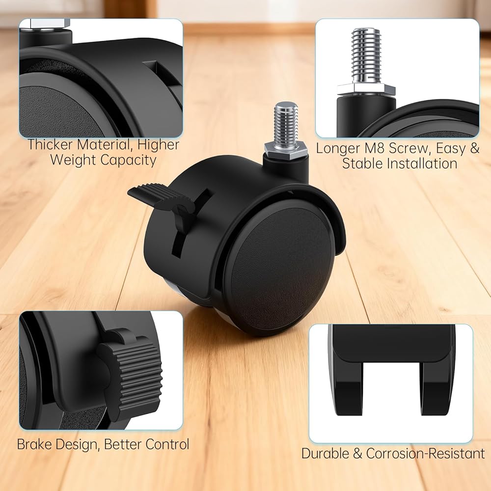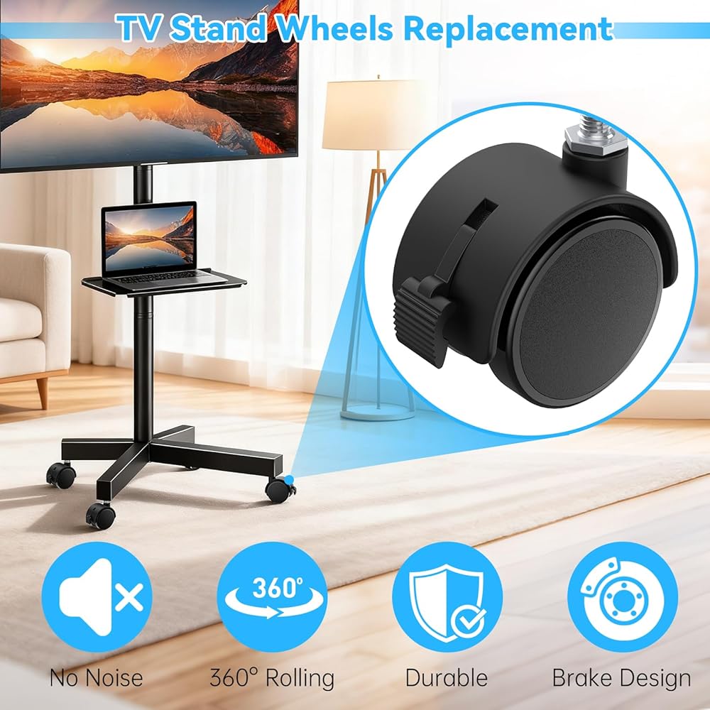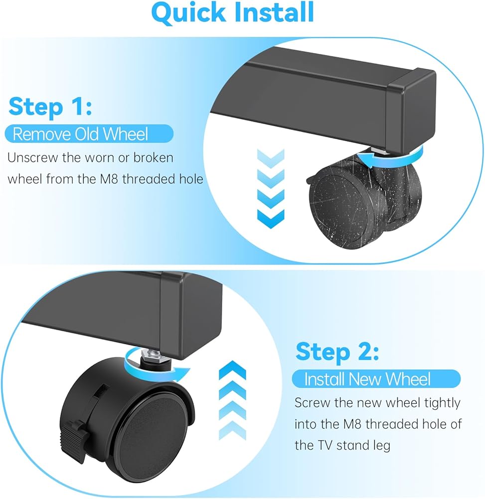 Heavy-duty tv stand replacement wheels with M8 threaded stem, smooth 360° swivel, quiet rolling, and easy installation—ideal caster wheels upgrade for your TV stand.