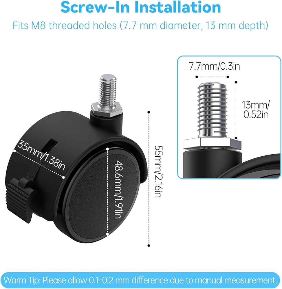 Package Included - Comes with 4 PCS 2-inch tv stand wheels with M8 (7.7mm×13mm) threaded stem, fitting threaded holes 7.7mm in diameter and 13mm deep. Wheel width 44mm, total height 57mm, perfect size for tv stand replacement wheels