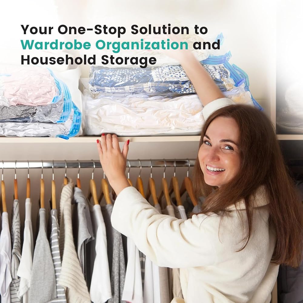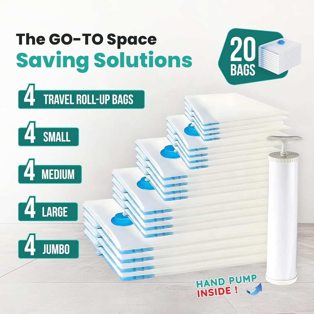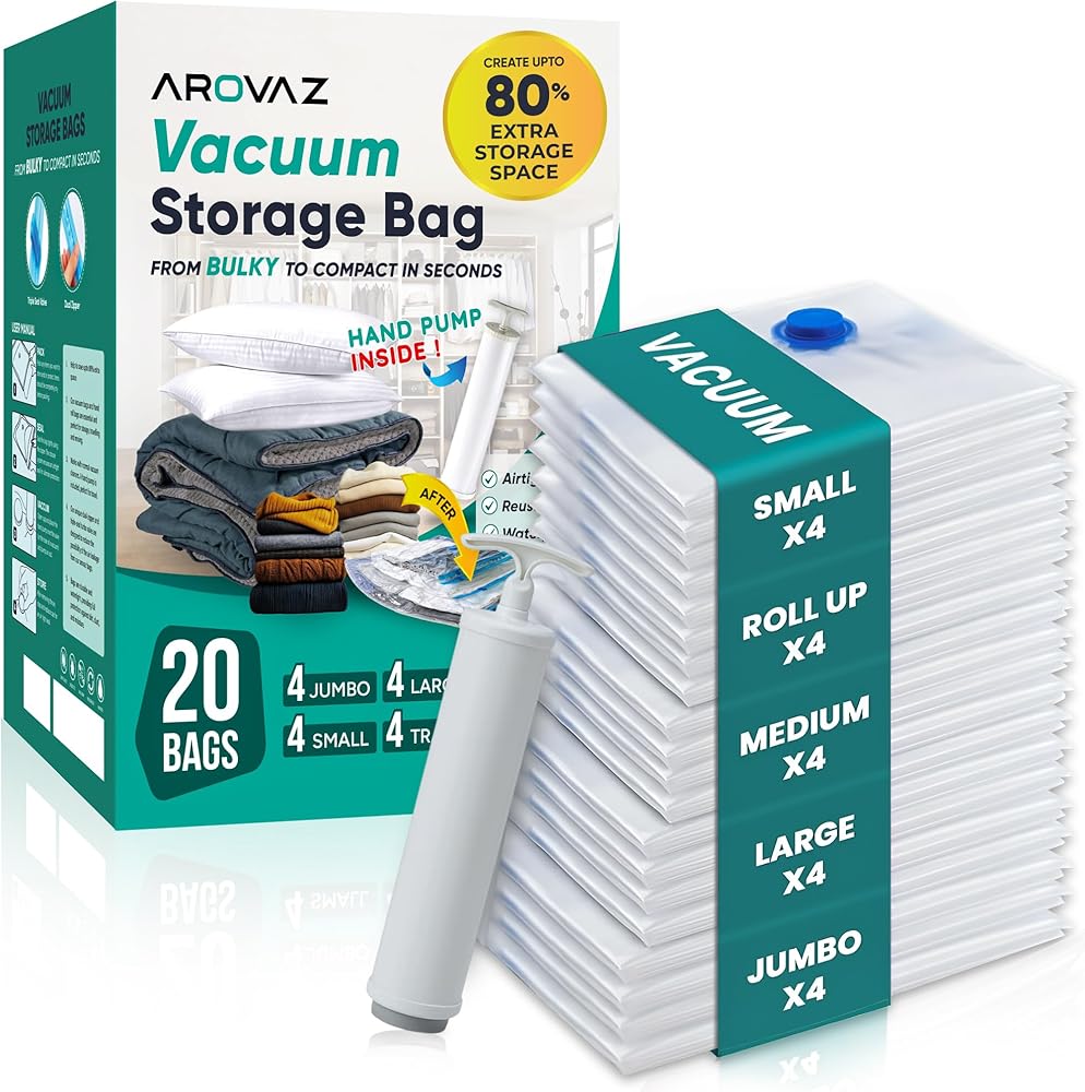 The AROVAZ Vacuum Storage Bags help you create more room in your closet, drawers, or luggage. Just fill, seal, and compress your clothes, blankets, and bedding. Your accessories take up less space while staying fresh and protected. Each set includes 20 bags in different sizes: 4 jumbo, 4 large, 4 medium, 4 small, and 4 roll-up bags. A hand pump is included for quick compression anytime, anywhere. Key Benefits: Save up to 80% storage space for clothes, bedding, and bulky items. Thick, durable plastic prevents leaks and resists tears. Double-zip seal and triple-valve design keep air out and freshness in. Reusable and easy to use for home storage, travel, or moving. Compact hand pump allows fast sealing without a vacuum cleaner.