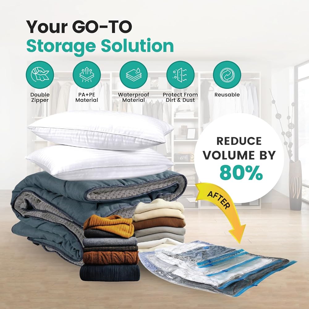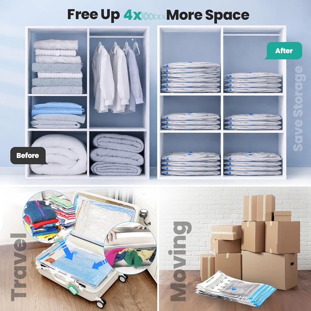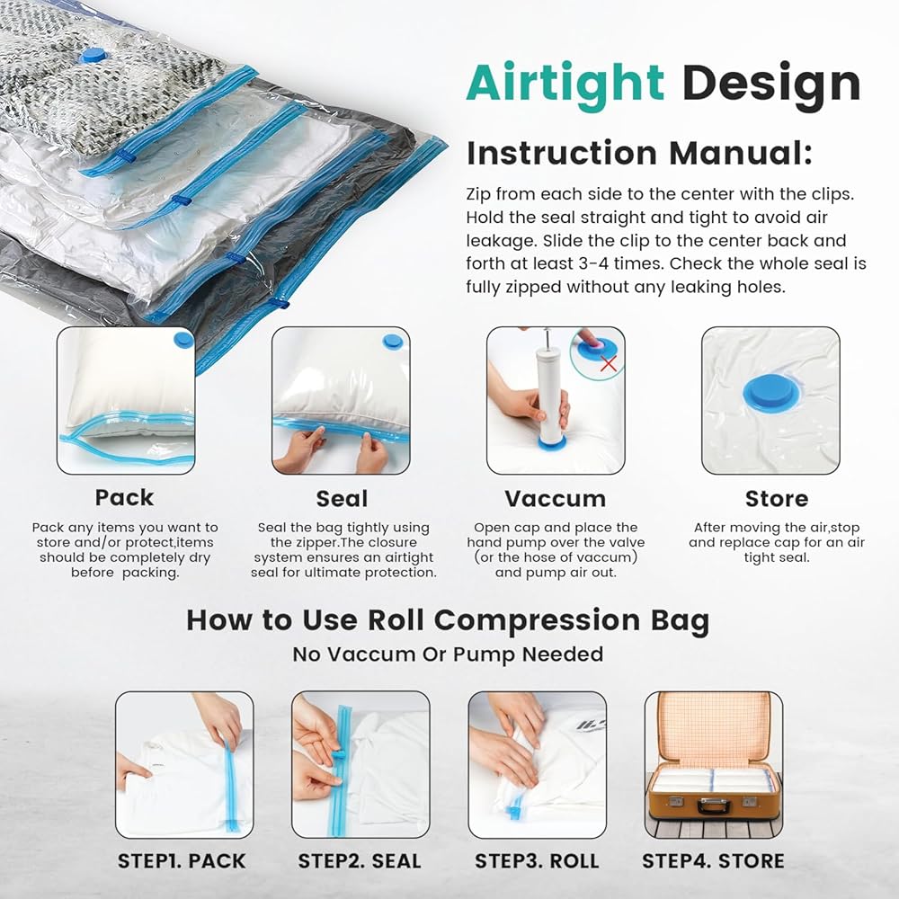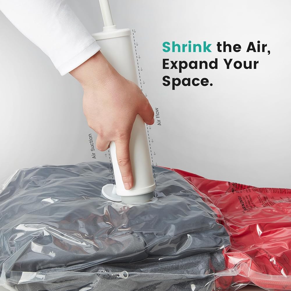 The AROVAZ Vacuum Storage Bags help you create more room in your closet, drawers, or luggage. Just fill, seal, and compress your clothes, blankets, and bedding. Your accessories take up less space while staying fresh and protected. Each set includes 20 bags in different sizes: 4 jumbo, 4 large, 4 medium, 4 small, and 4 roll-up bags. A hand pump is included for quick compression anytime, anywhere. Key Benefits: Save up to 80% storage space for clothes, bedding, and bulky items. Thick, durable plastic prevents leaks and resists tears. Double-zip seal and triple-valve design keep air out and freshness in. Reusable and easy to use for home storage, travel, or moving. Compact hand pump allows fast sealing without a vacuum cleaner.