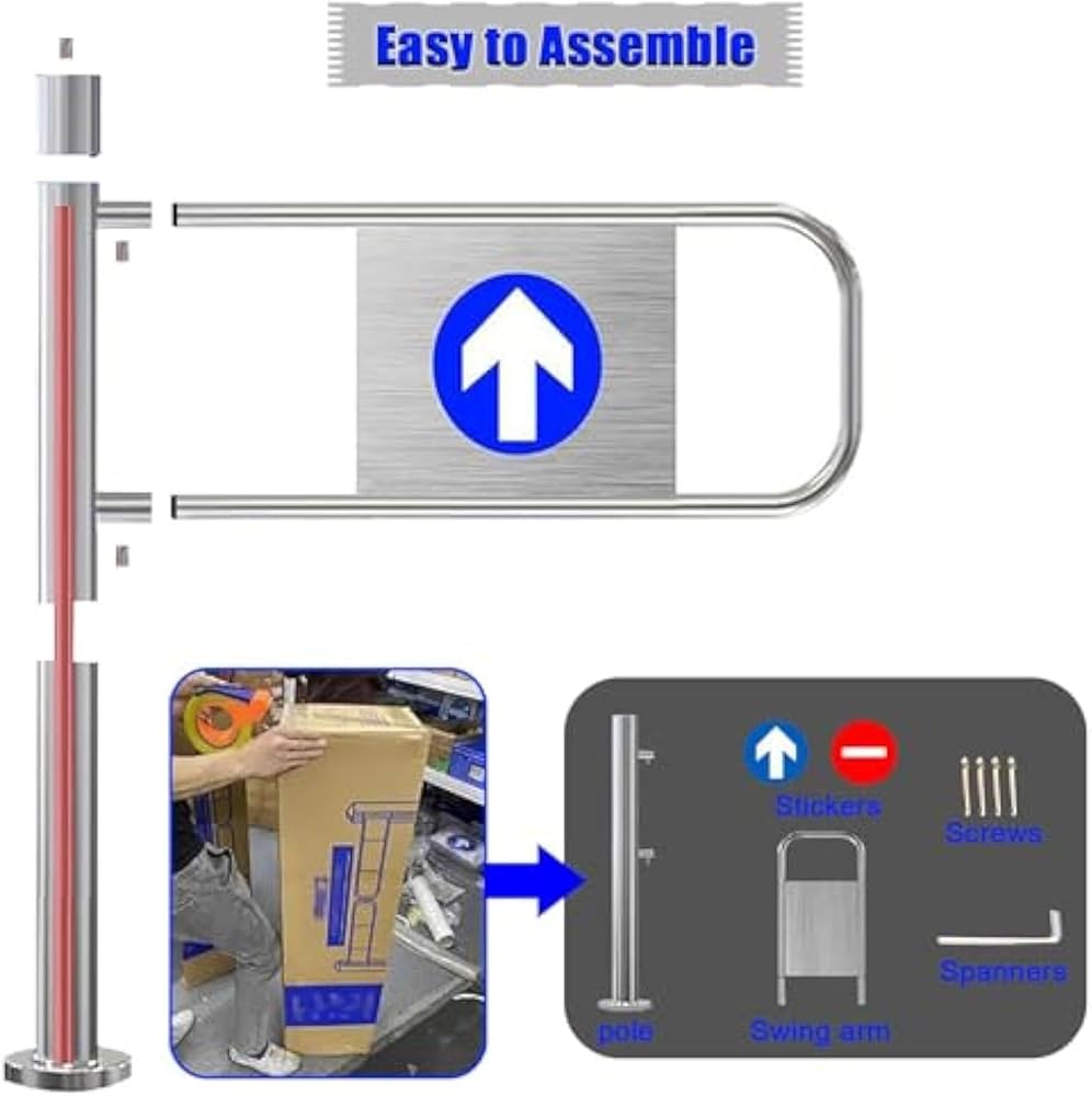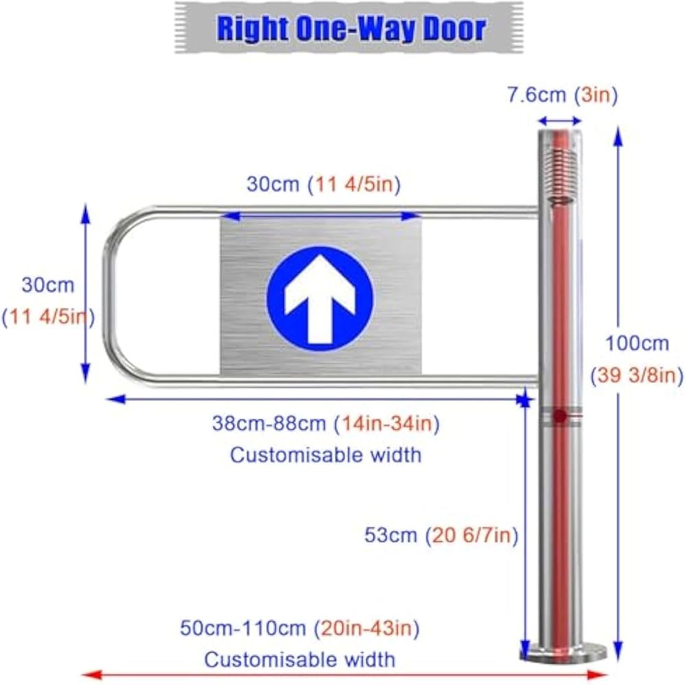 Supermarket Entrance Security Door,,Are you facing challenges with crowded entrances and disorganized spaces? Our one-way opening door is the ideal solution to facilitate smooth crowd movement, ensuring a clear and controlled pathway for entry and exit. With a gentle push, the door opens effortlessly and automatically closes behind you, enhancing safety and convenience in various settings. **Product Features:** - Height of 100cm (39 inches) with customizable width options to meet your specific requirements. - Designed for entry only, effectively preventing unauthorized exit traffic. - Constructed from durable stainless steel, providing water resistance and long-lasting durability. - Compact design allows for easy installation in diverse environments, from warehouses to parking lots. - Secured with expansion screws for stability, reducing the risk of tipping. - Innovative spring mechanism ensures automatic closing for a seamless experience. - Opens with a simple push and closes automatically after passage. **Specifications:** - Material: Stainless steel tubing - Color Options: Silver-L, Silver-R - Height: 103 cm - Length Options: 50/60/70/80/90/100 cm (customizable) - Installation: Drilling installation required - Perfect for use in warehouses, construction sites, traffic management areas, garages, parking facilities, and work zones. **Package Includes:** 1 x Swing Gate **Important Notice:** Simply push the door open with your hand when entering; it will rebound and close automatically after use. If the swing arm is too long for your setup, it can be trimmed to fit your needs. Transform your space with our one-way opening door, designed to enhance organization and improve traffic flow in any high-traffic area. !