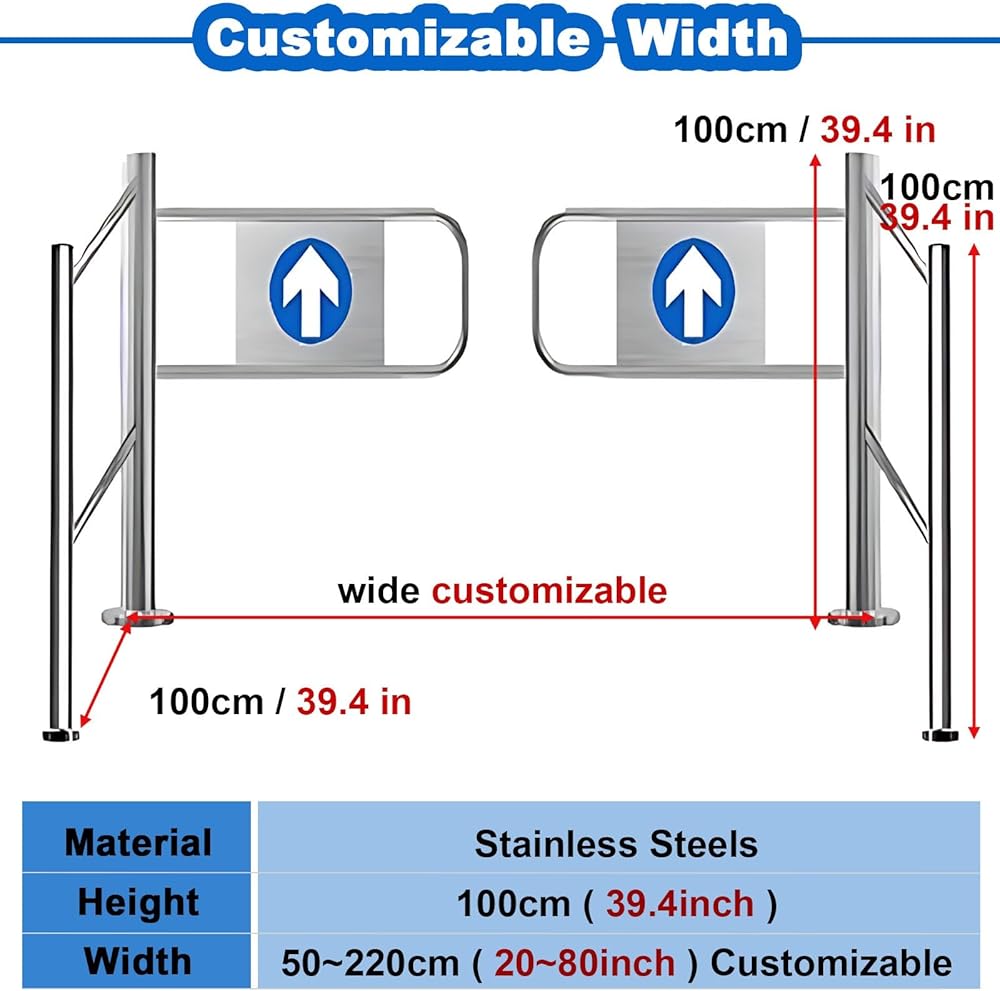 Supermarket Entrance Security Door,,Experience efficient crowd management with our one-way opening door, expertly designed to optimize pedestrian flow in high-traffic areas. This innovative solution facilitates smooth entry and exit, promoting safety and organization in busy environments. A gentle push opens the door, which automatically returns to a closed position, enhancing both safety and efficiency. **Product Specifications:** - **Color:** Silver - **Material:** Durable Stainless Steel - **Door Post Diameter:** 7.6 cm (3 in) - **Door Post Height:** 100 cm (39 3/8 in) - **Swingarm Height:** 30 cm (11 4/5 in) - **Swingarm Widths:** Customizable from 100-200 cm (40-80 in) **Key Features:** 1. **Customizable Width:** The 100 cm height is perfect for various environments, with adjustable swingarm widths to fit your specific needs. 2. **One-Way Entry:** Designed for controlled access, the swing gate allows entry only, minimizing confusion and ensuring a clear exit path. 3. **Weather-Resistant Construction:** Made from stainless steel, this door is waterproof and wear-resistant, suitable for both indoor and outdoor applications. 4. **Quick Installation:** With a compact design, this door can be swiftly installed and is ready for immediate use. 5. **Sturdy Support:** Equipped with expansion screws for stable installation, this door remains upright even in bustling conditions. 6. **Automatic Return:** The integrated spring mechanism ensures the gate closes automatically after use, maintaining a continuous flow of foot traffic. 7. **User-Friendly Operation:** A simple push is all it takes to open the door, enhancing the overall user experience. **Package Includes:** - 1 x One-Way Pedestrian Passage Door (Note: Other display items are not included.) **Important Notes:** - This product serves as a one-way entrance guide and is not intended as a security barrier. - Color variations may occur slightly. our one-way opening door today to enhance