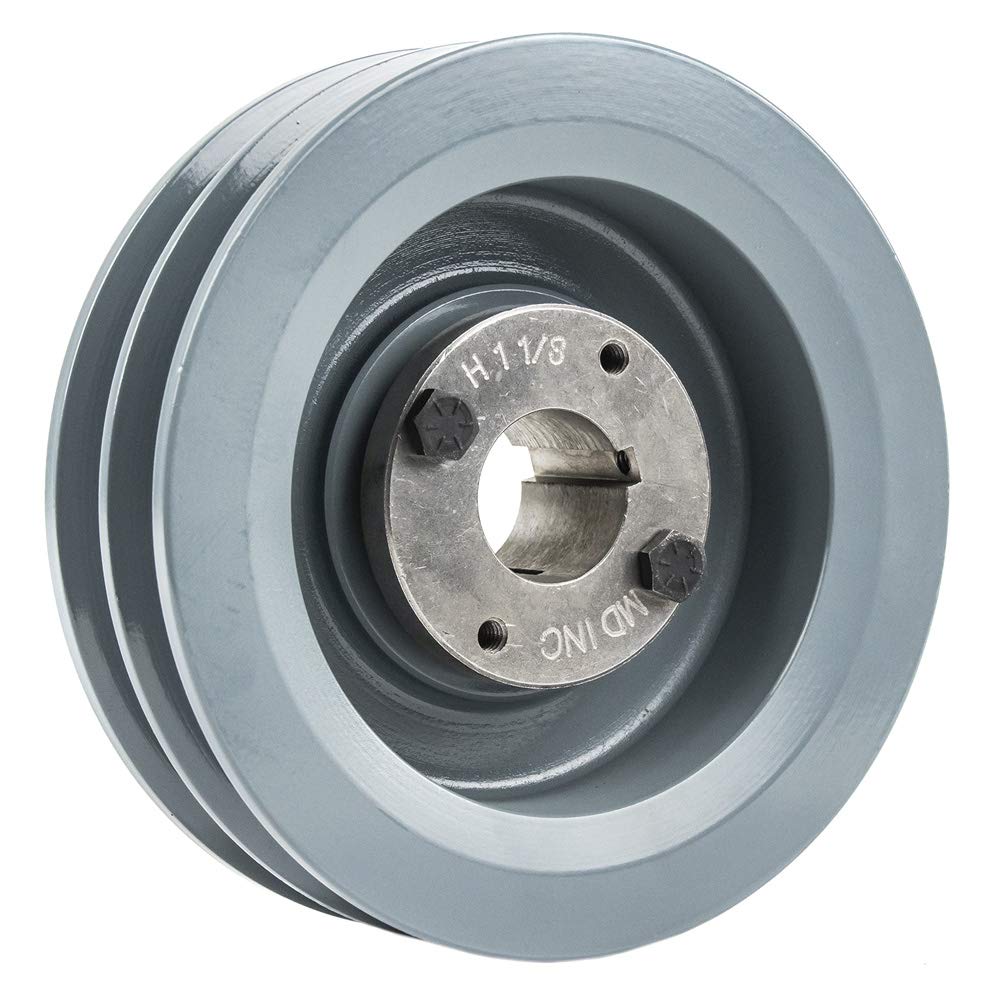 Cast Iron 6" Pulley Dual Groove B Section V Belt 5L w/ 1-1/8" Sheave Bushing Masterdrive dual groove 6" cast iron pulley/sheave with 1-1/8" H bushing for B section belt. This is a high-quality 2-piece pulley that measures 6" outside diameter and is designed to be used with an H style bushing. This 1-1/8" bushing (Included) inserts into the center of the pulley and slides over the shaft. As you tighten down the bolts on the H bushing it will tighten down on the shaft making this style of pulley much more secure than a standard single-piece pulley. This listing includes an H bushing to fit on a 1-1/8" shaft. The bushing itself is made of solid steel and is precision machined to ensure high quality and secure attachment to your motor/engine shaft. This pulley accepts B Section also known as 5L series belts. These belts are 5/8" wide. This pulley will work with A Section belts Also known as 4L; however, they will sit farther down in the groove which will reduce your pulley size by 1/4" to 1/2" on average, depending on the size of pulley. Specifications: Dual Groove Pulley 1-1/8" Bushing Included Accepts: B Section / 5L Section Belts High-Quality Cast Iron Construction Solid Steel Bushing For Use on 1-1/8" Shaft Outside Diameter of Pulley: 6"