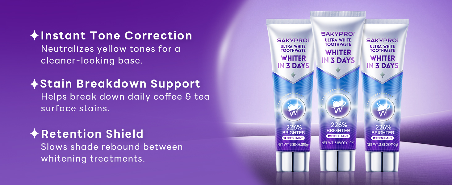 تصحيح فوري للألوان: تعمل التركيبة الأرجوانية على تحييد درجات اللون الصفراء بسرعة للحصول على ابتسامة أكثر إشراقًا وبياضًا - مثالية للمسات النهائية السريعة أو الاستخدام اليومي.