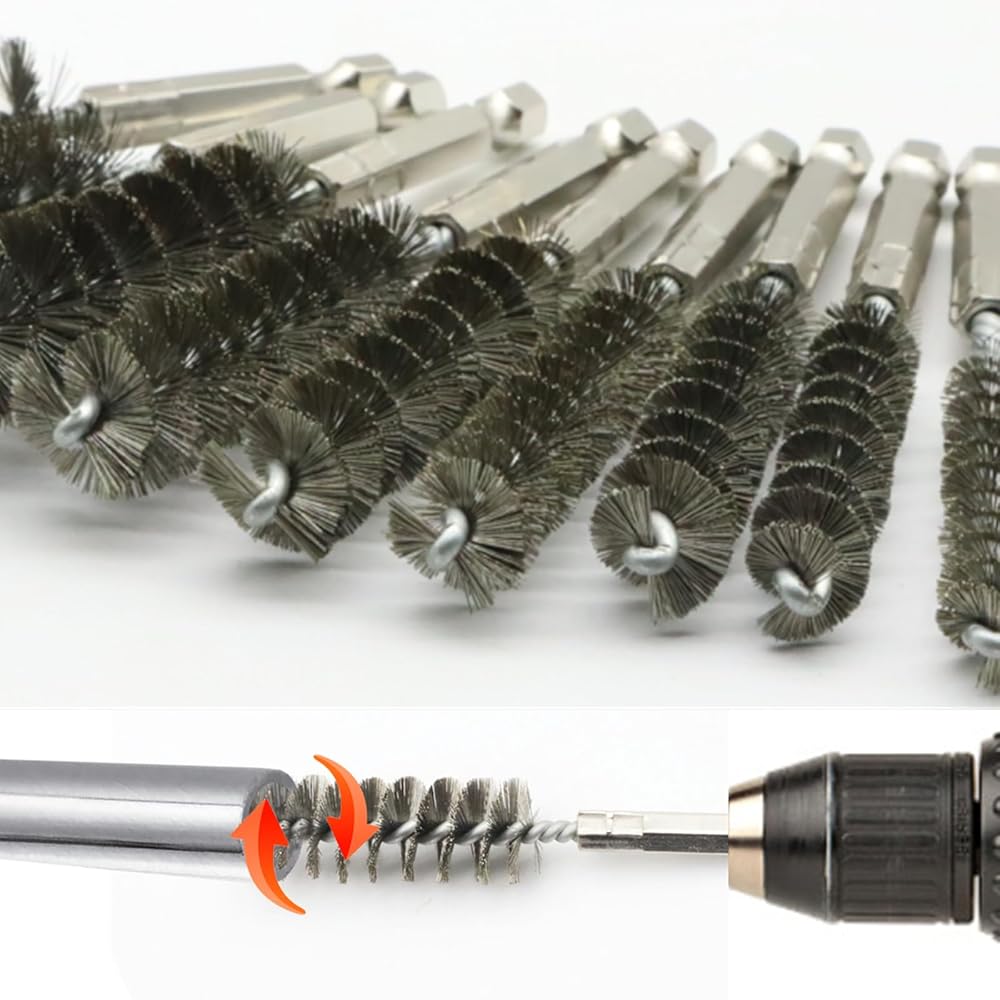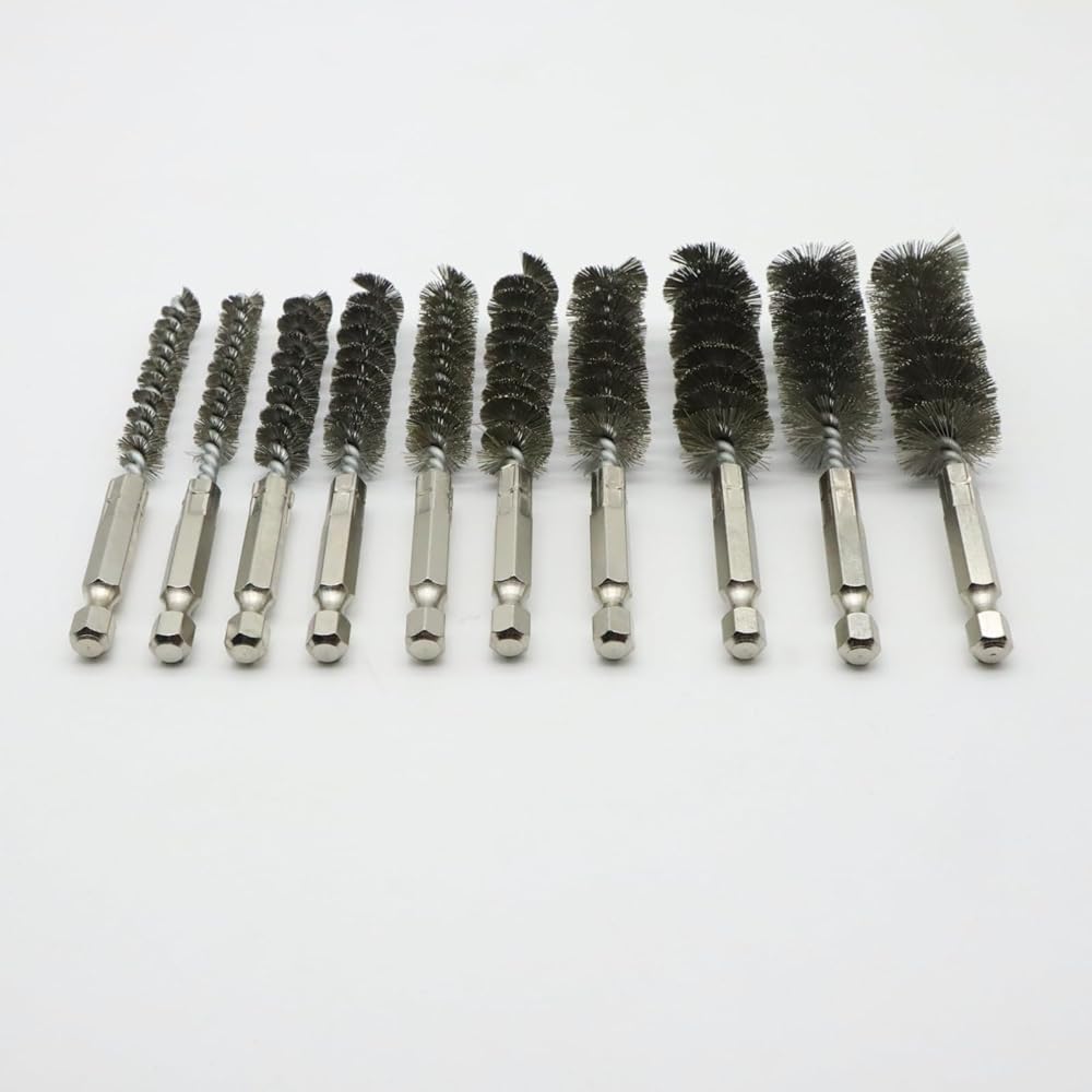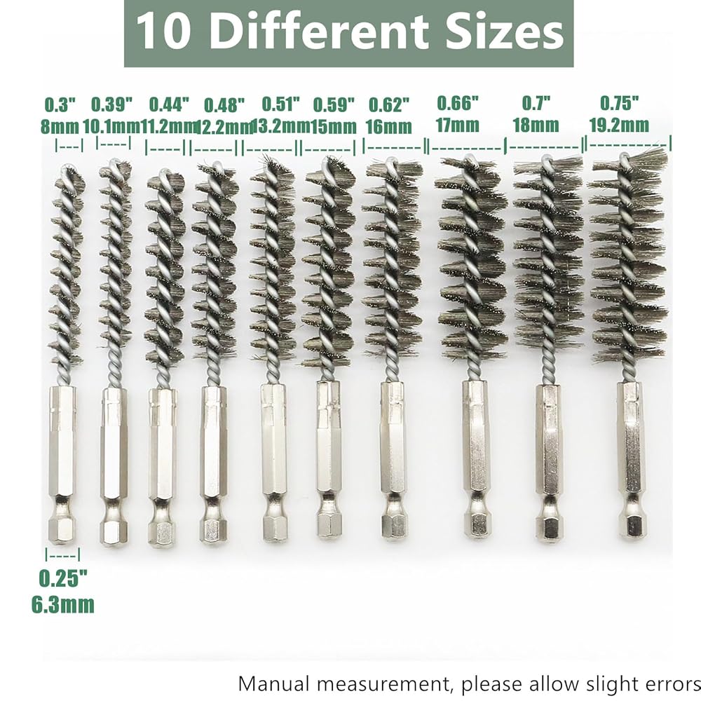 10 Different Size Bore Brush Set: The set of wire brushes for cleaning rust contains 6 different diameter: 0.31" (8mm), 0.39"(10mm), 0.44"(11mm), 0.47"(12mm), 0.51(13mm), 0.59"(15mm), 0.62"(16mm), 0.67"(17mm), 0.7"(18mm) and 0.75"(19mm). Wire tube brush total length is 4inch. Various sizes of steel wire brush for drill meet your different hole cleaning needs.