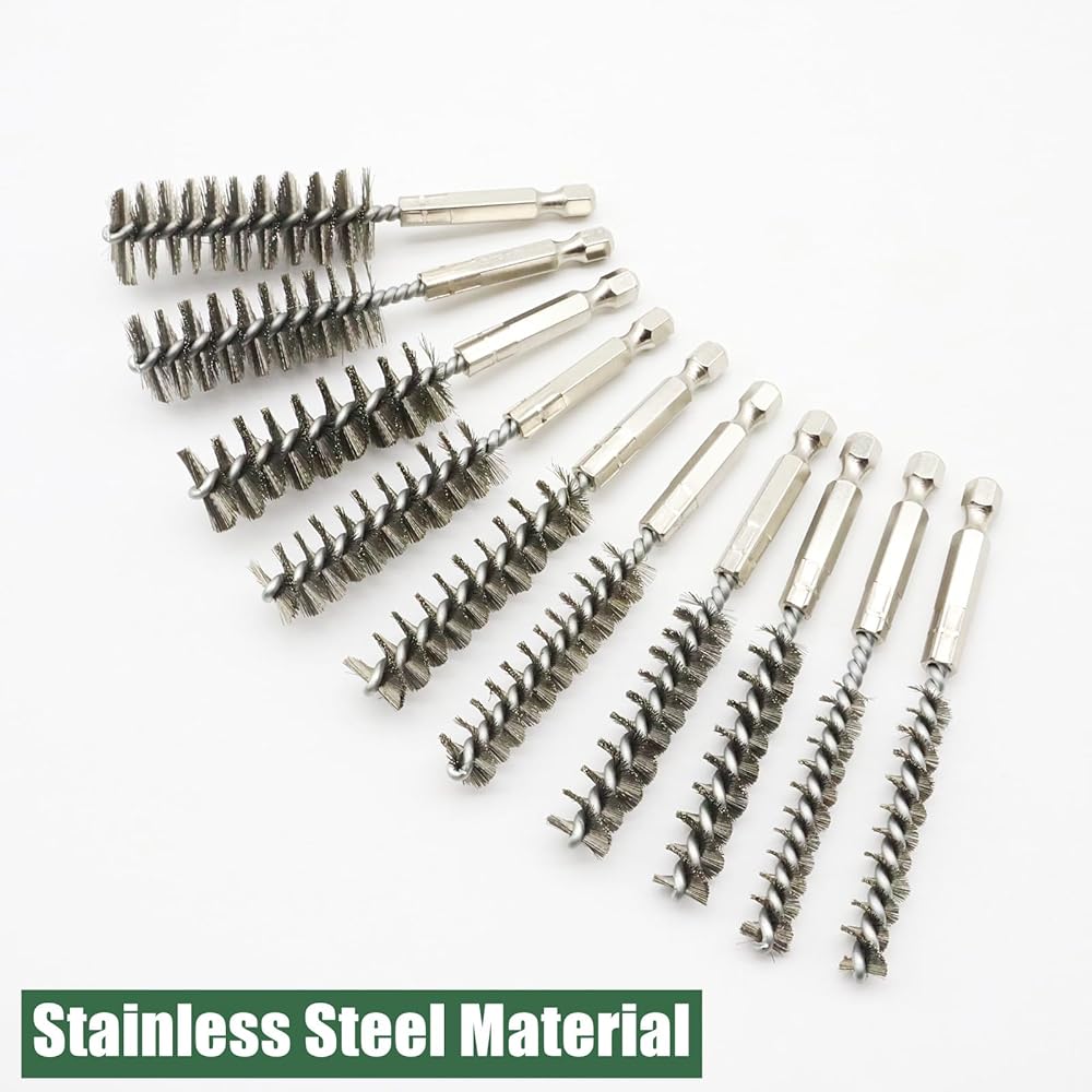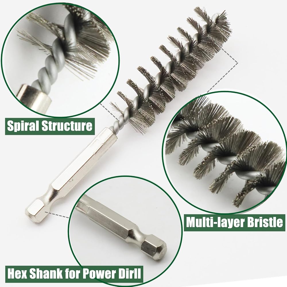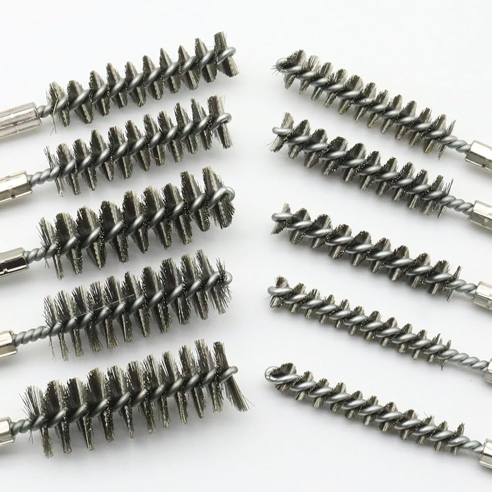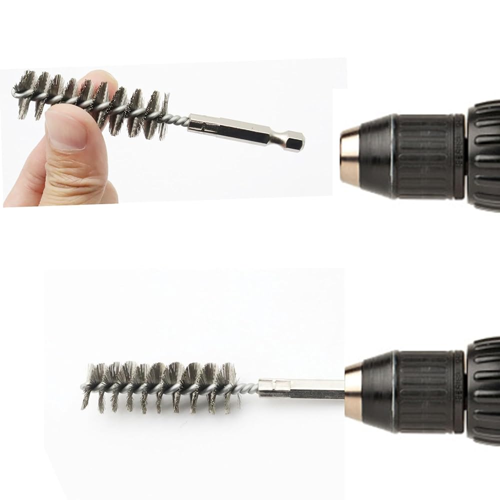 10 Different Size Bore Brush Set: The set of wire brushes for cleaning rust contains 6 different diameter: 0.31" (8mm), 0.39"(10mm), 0.44"(11mm), 0.47"(12mm), 0.51(13mm), 0.59"(15mm), 0.62"(16mm), 0.67"(17mm), 0.7"(18mm) and 0.75"(19mm). Wire tube brush total length is 4inch. Various sizes of steel wire brush for drill meet your different hole cleaning needs.