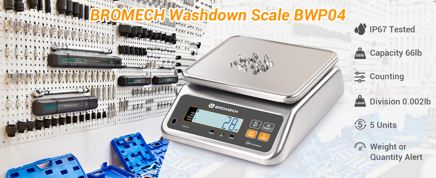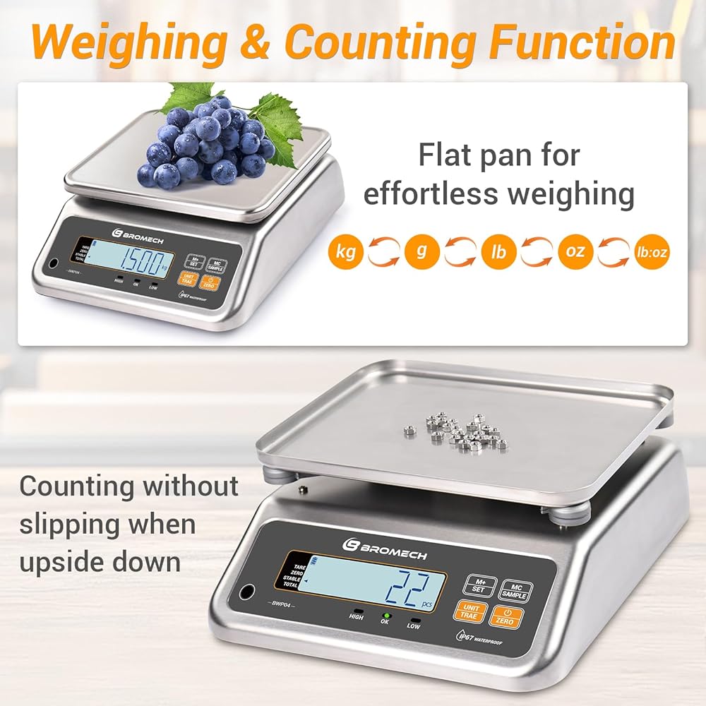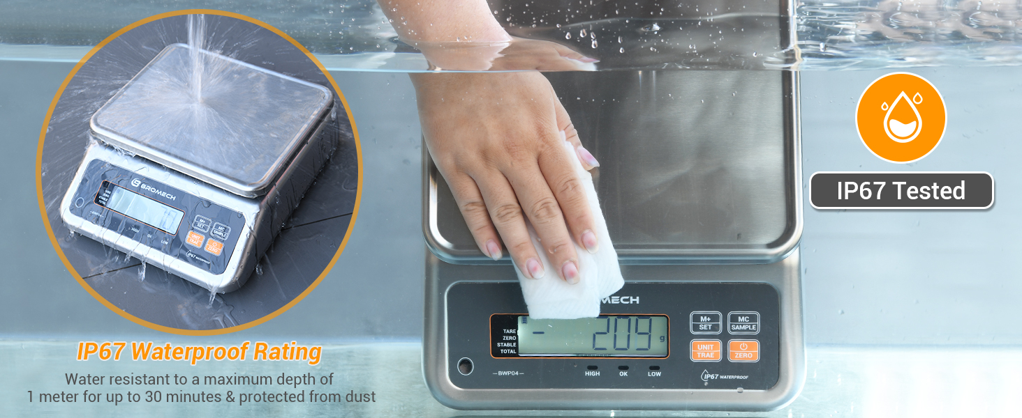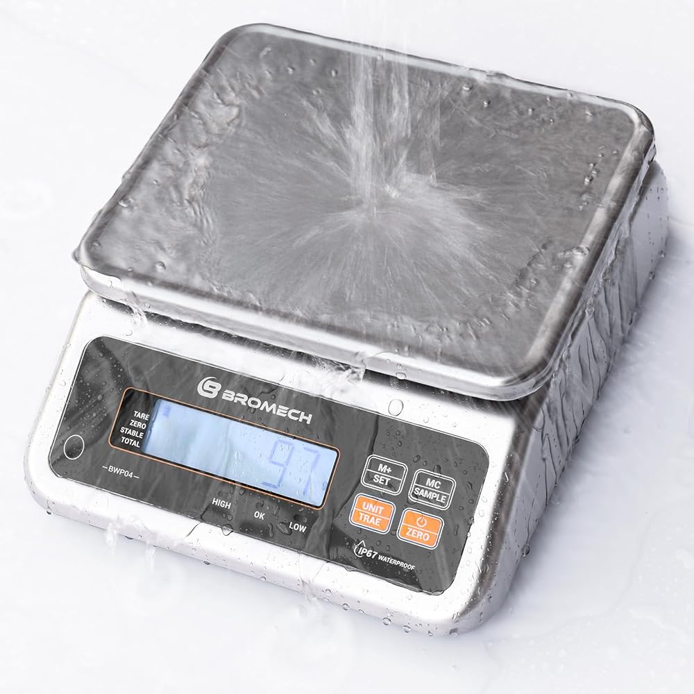 [تصميم IP67 مقاوم للماء] ميزان الطعام BROMECH هو رفيقك المثالي لقياسات المنتجات الرطبة الدقيقة. مصنوع من الفولاذ المقاوم للصدأ المقاوم للتآكل مع منصة محكمة الغلق وفتحتين للتصريف لضمان جفاف المستشعر، يُعد ميزان الغسيل هذا مثاليًا للخبز والشموع التي يمكنك صنعها بنفسك، مما يوفر الموثوقية في البيئات الرطبة.