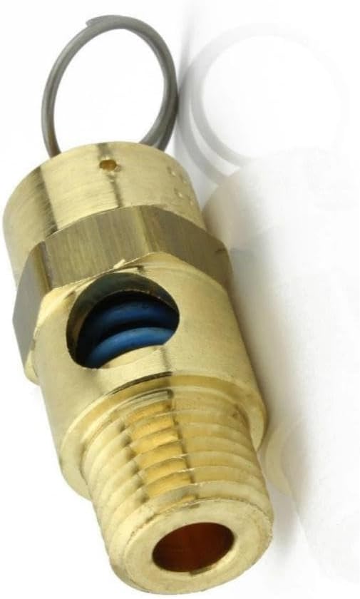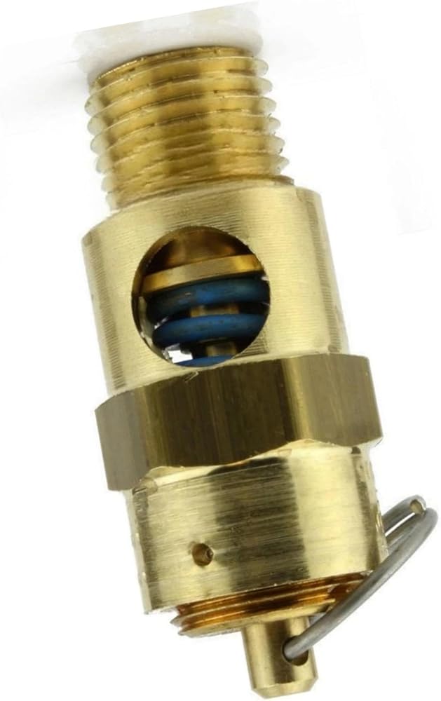 • 1/4" male NPT 30 PSI Industrial air compressor / tank pressure safety relief valve. Also known as a "Pop Off" or "Blow Off" valve. The relief pressure of this valve is set at 30 PSI and is accurate within + or - 3% of the set pressure. Specifications: This valve will relieve 35 SCFM Valve Inlet Threads: 1/4" Male NPT (measure about 1/2" in diameter) Total Valve Length: 1-3/4" Installation Wrench Size: 11/16" Features a silicone rubber soft seat relief valve to prevent leaks Max temperature: 250° F Solid Brass Construction