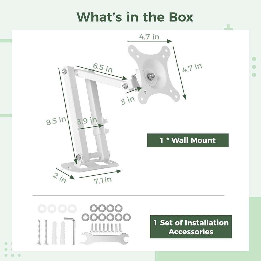 Color: White Material: Iron Package Size: 5.7 * 7.3 * 3.4 inches Package Includes: 1 * Wall Mount, 1 Set of Mounting Accessories Note: - Please refer to the measurement. Tiny measuring error is allowable in normal range. - There might be a little color difference due to the monitor, camera or other factors, please refer to the physical item.