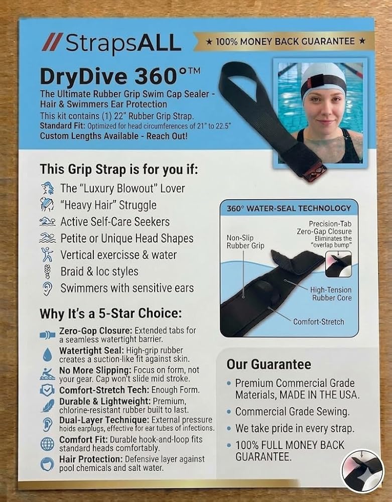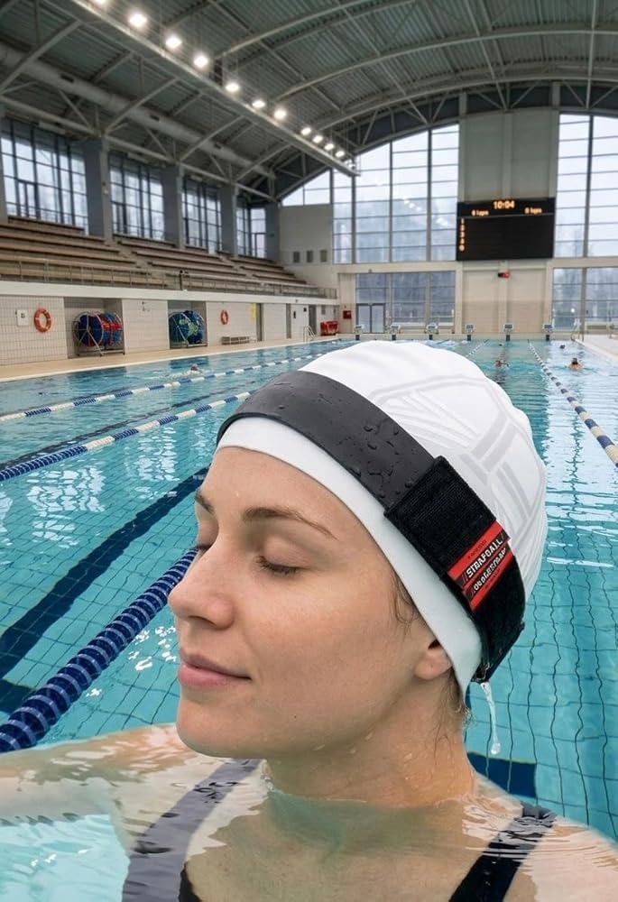 Designed to be worn over your swim cap, StrapsALL's DryDive 360° creates a firm, 100% watertight barrier around your hairline, ensuring that your cap stays put and water stays out to protect your hair and prevent swimmer's ear. Our Rubber Grip Swim Strap is the ultimate secondary seal. Standard Fit: Optimized for head circumferences of 21" to 22.5". Engineered for the Perfect Seal: Our 360° water-seal technology features a high-tension, 22-inch rubber core designed to contour perfectly to the standard adult head. With our unique Precision-Tab closure, the hook-and-loop extensions provide a low-profile, flush fit that eliminates the bulky "overlap bump" found in cheaper straps.