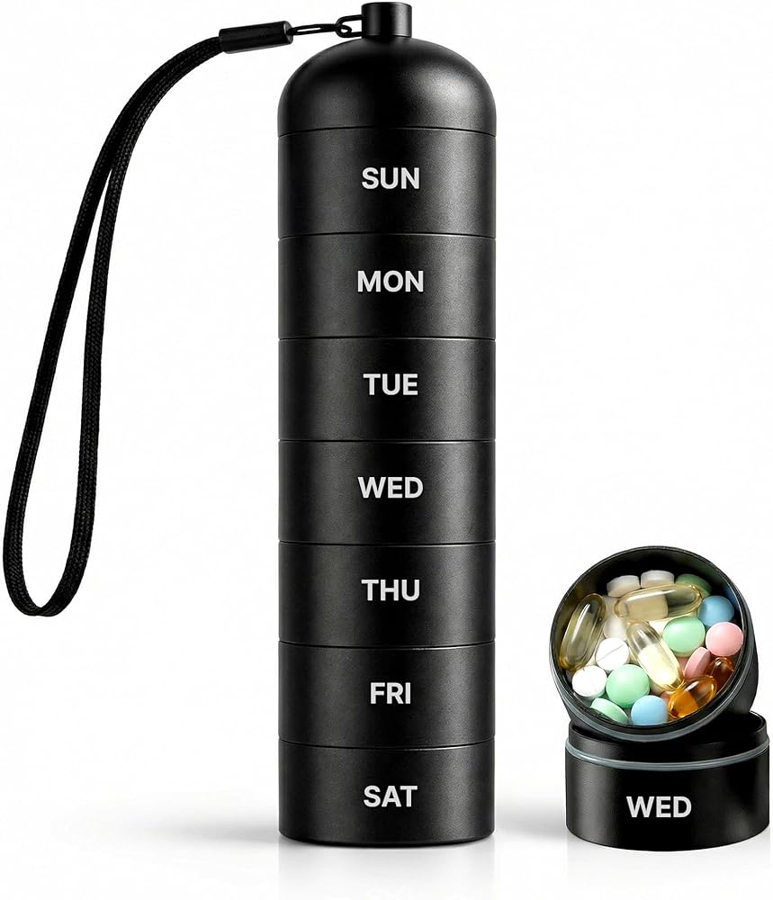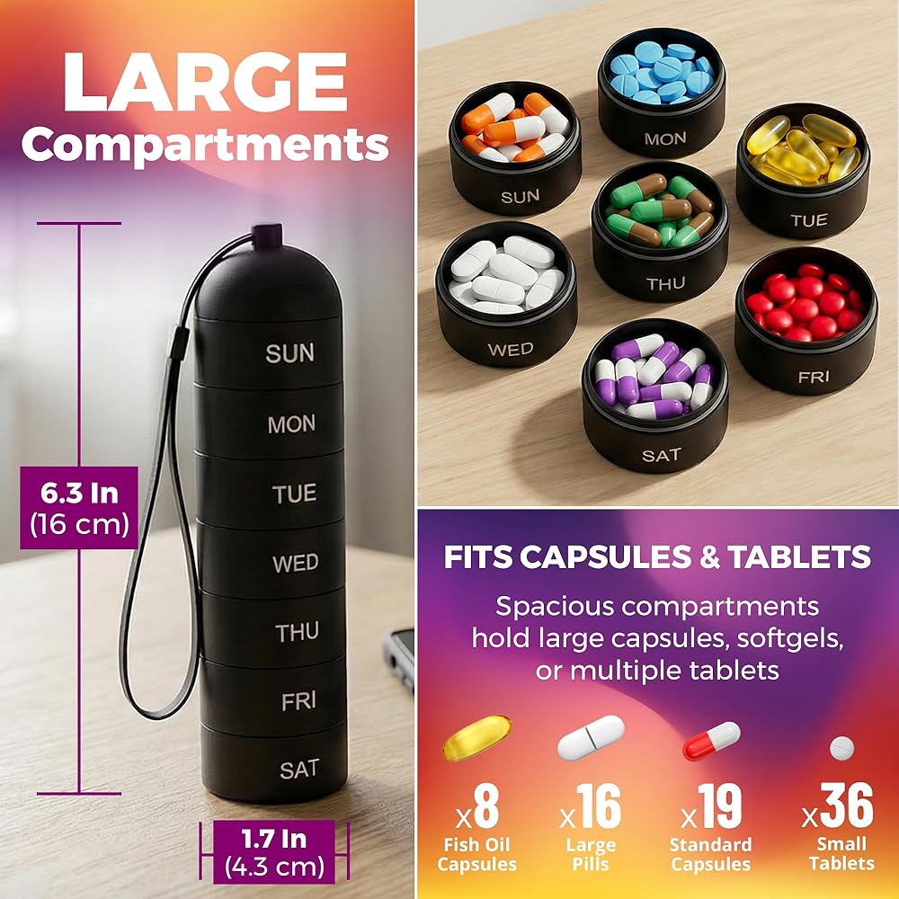 LARGE CAPACITY & STACKABLE DESIGN: Seven spacious compartments comfortably fit large capsules, fish oil softgels, or multiple tablets for the entire week. The modular stackable body twists securely together, and you can carry one, several, or all seven sections depending on your trip length. Compact yet roomy, it's ideal for efficient organization without wasted space.