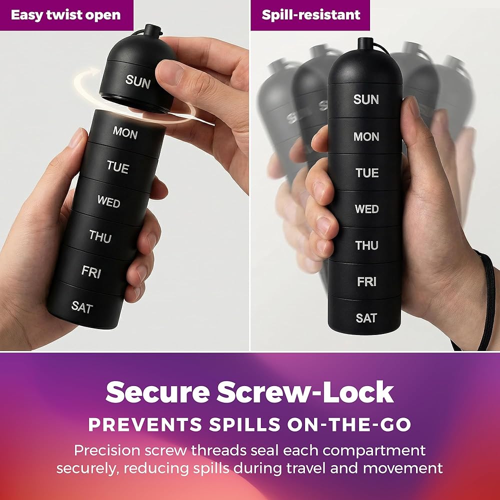 SECURE SWING-LOCK THREAD SYSTEM: Built with a precision screw-lock mechanism, each compartment seals tightly to prevent accidental openings, spills, or cross-threading. Pills stay locked in place even during rough travel. The smooth threading and easy-grip texture make it simple to open and close, ensuring security without sacrificing convenience or style.