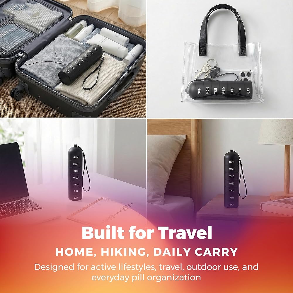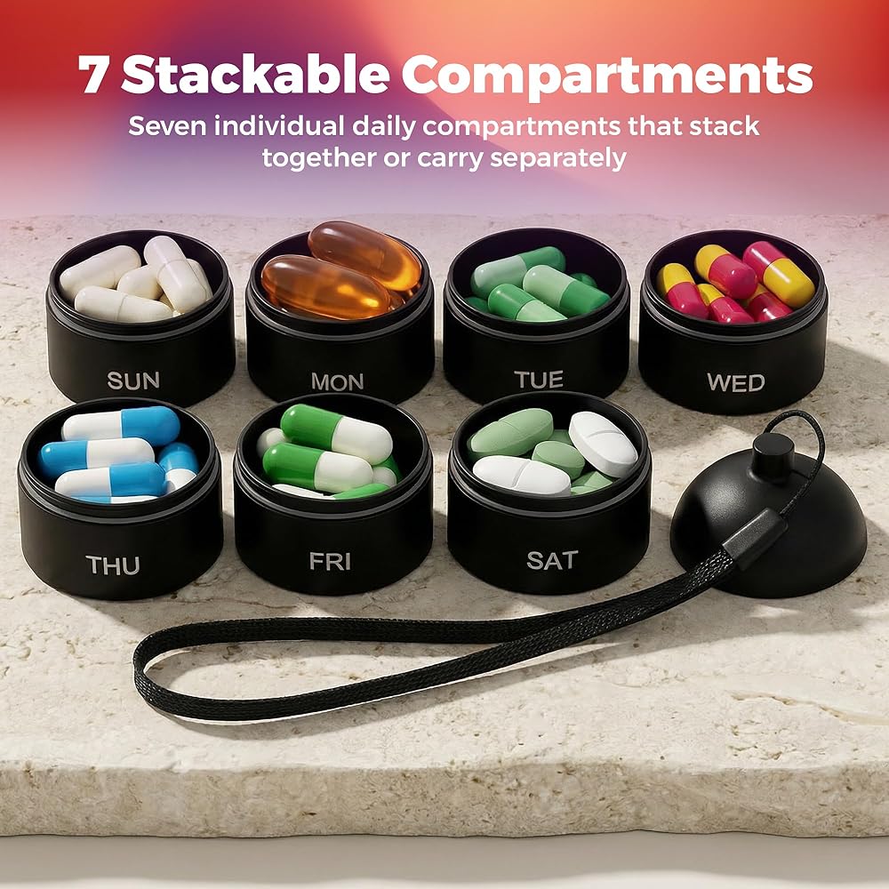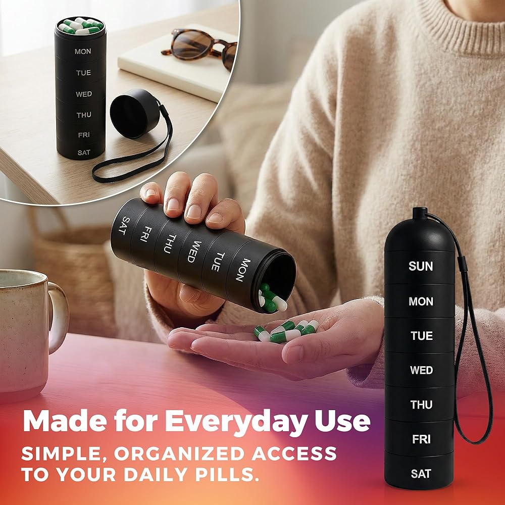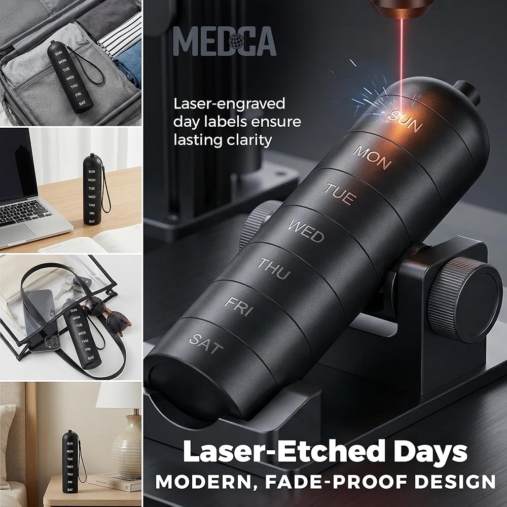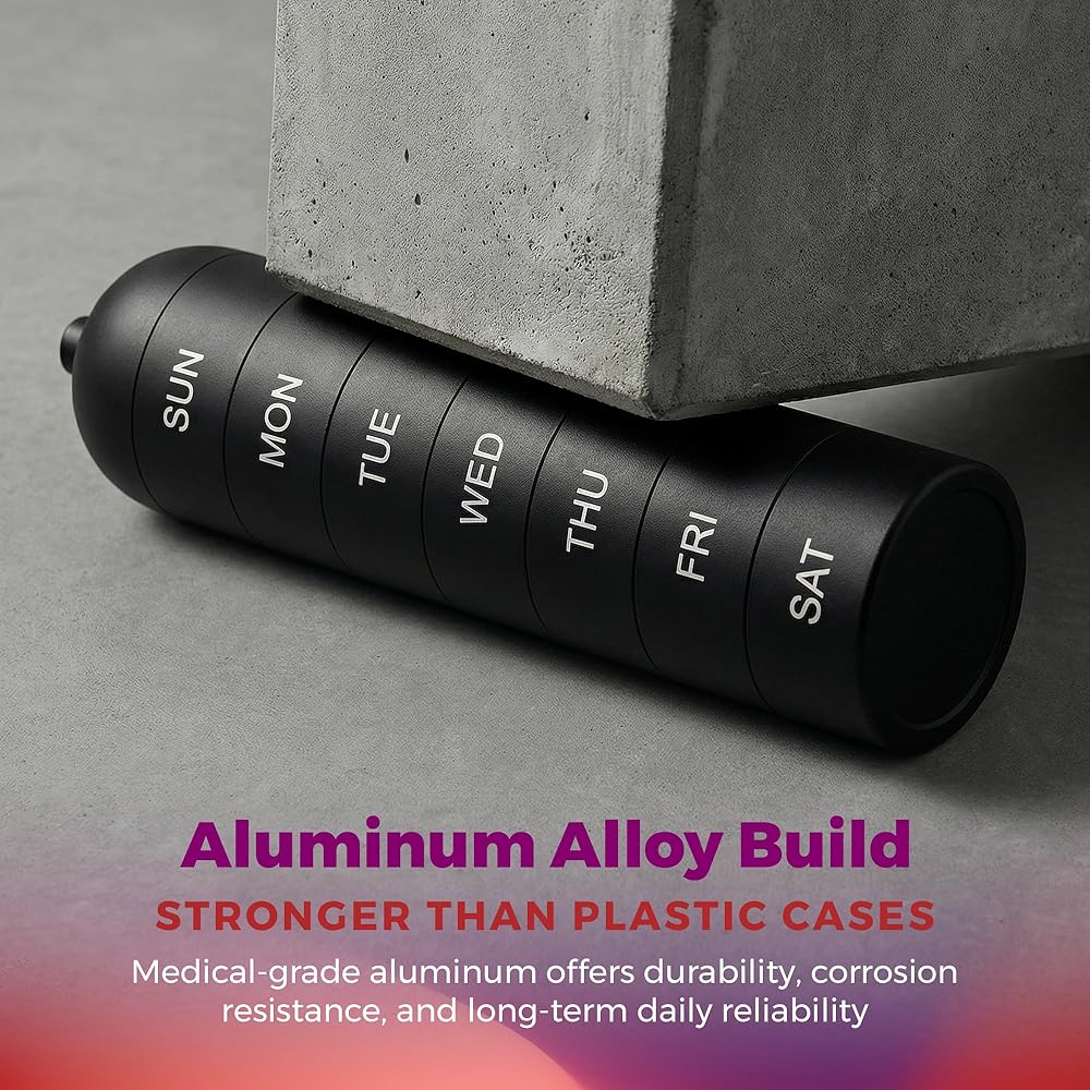 LASER-ETCHED DAY LABELS & MODERN STYLE: The days of the week are permanently laser-engraved into the metal no fading, peeling, or rubbing off over time. The sleek matte metallic finish and minimalist silhouette give this pill box a premium, travel-ready look that's both functional and stylish. Built to last and designed for convenience, it's a dependable and elegant solution for daily medication management.