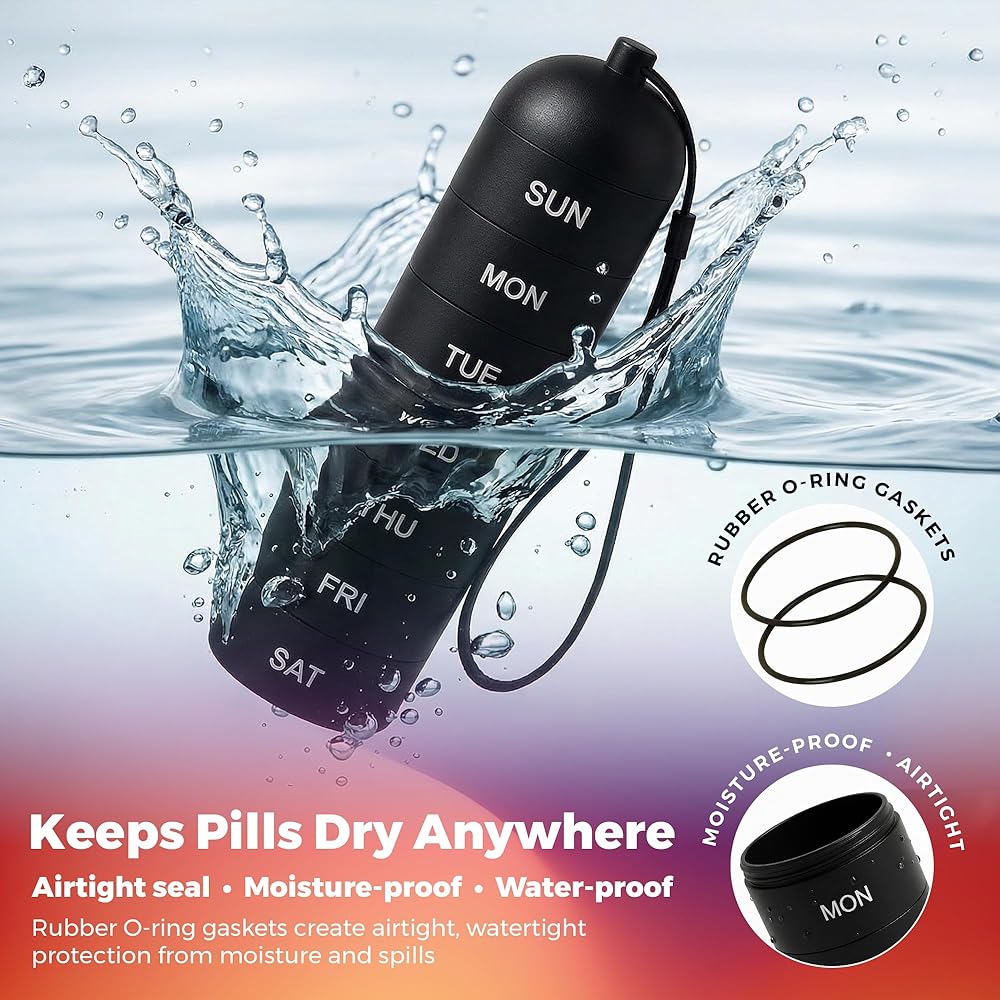WATERPROOF & MOISTURE-PROOF SEAL: Each compartment features a rubber O-ring gasket for an airtight, watertight seal that shields your pills from humidity, rain, or spills. Perfect for hiking, camping, or travel, this design keeps your medications dry and fresh even in changing climates, ensuring your vitamins and supplements stay potent and protected wherever you go.