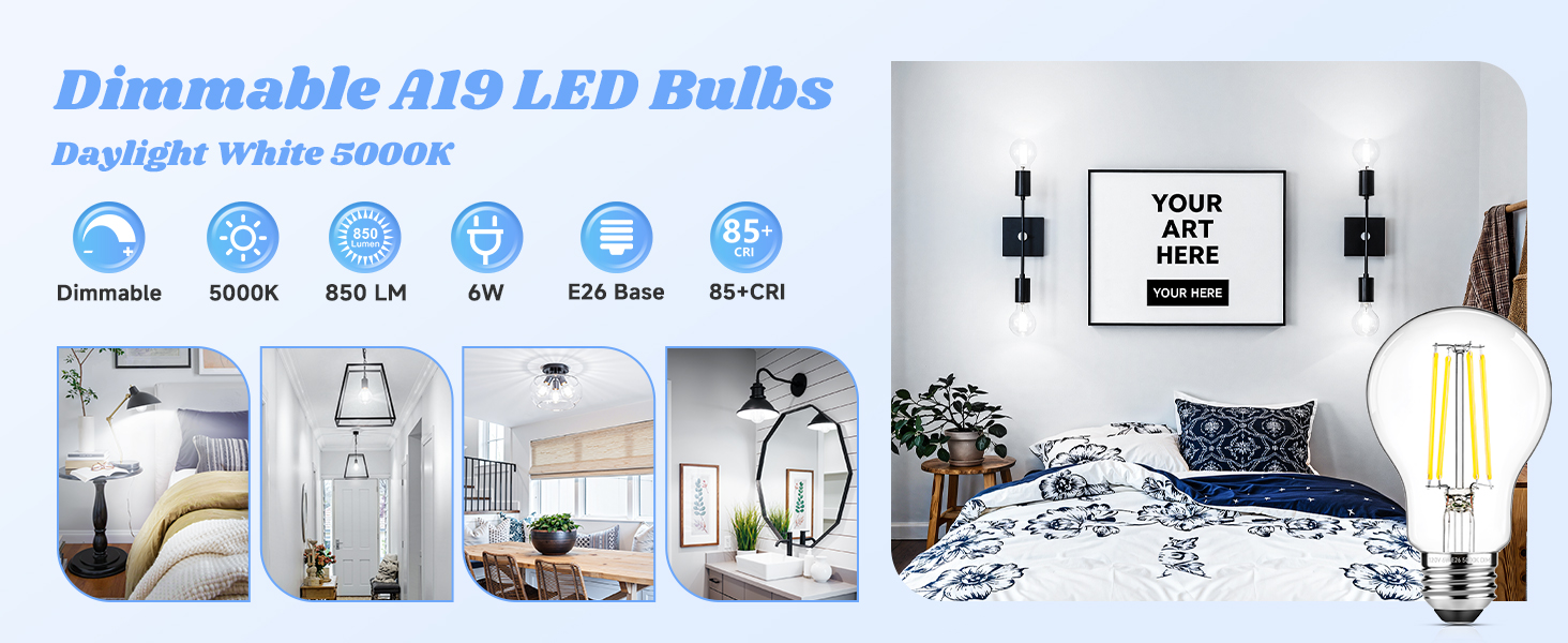 توفير الطاقة وفعالية التكلفة: استبدل المصابيح المتوهجة التقليدية بقدرة 60 وات بهذه المصابيح ذات الشعيرات A19 LED بقدرة 6 وات وقلل من تكلفة الطاقة. تولد مصابيح الإضاءة A19 LED المتينة هذه حرارة أقل، وتتطلب صيانة أقل، وتحافظ على سطوع ممتاز بمرور الوقت - وهي مثالية للإضاءة الصديقة للبيئة والفعالة من حيث التكلفة