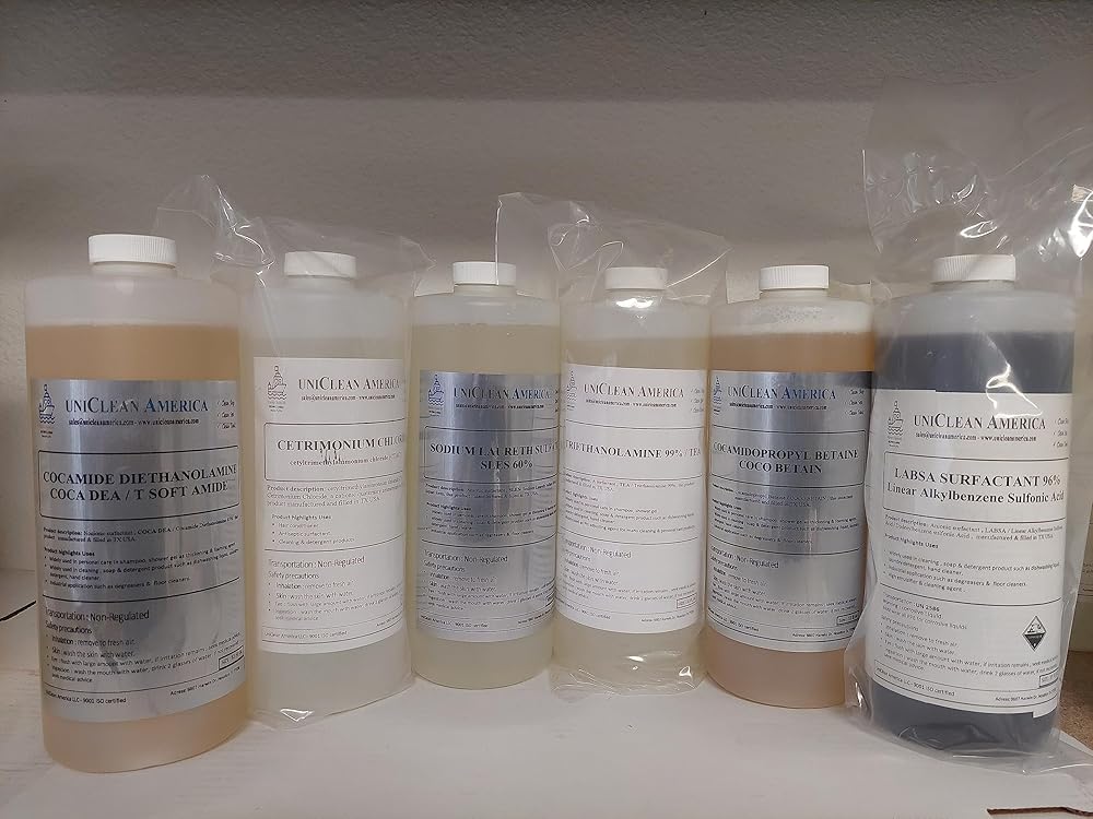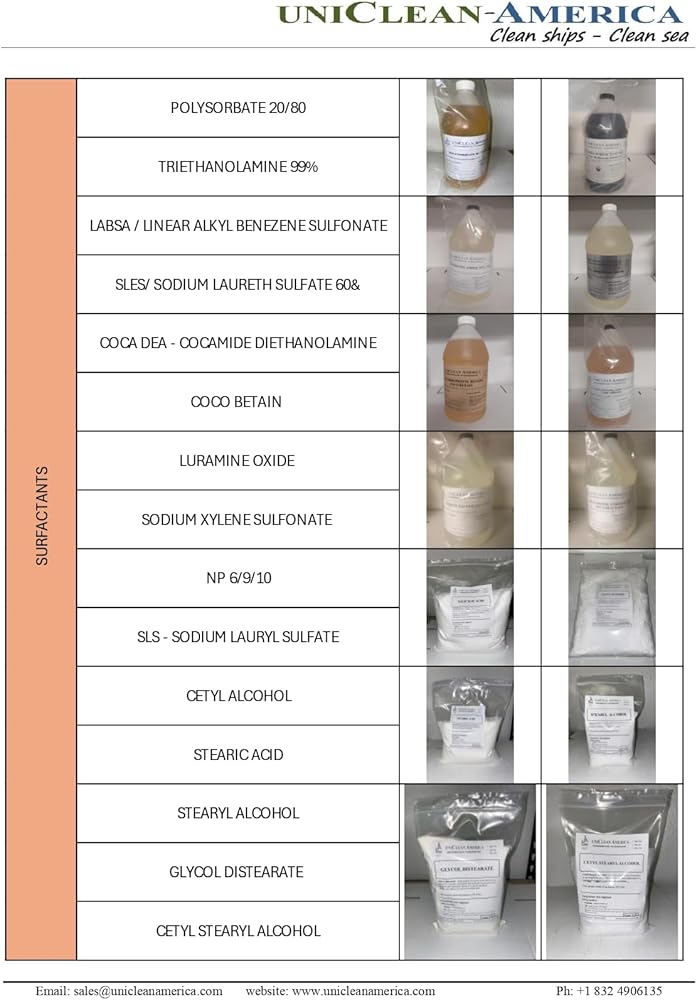 UniClean America provides full range of surfactants anionic, cataionic, non ionic & amphotric surfactants used in all types of making personal, cosmetics and industrial use such as soap, detergents, shampoo, industrial cleanerss & degreasers in small size bottles from 16 fl oz to 128 fl oz.
