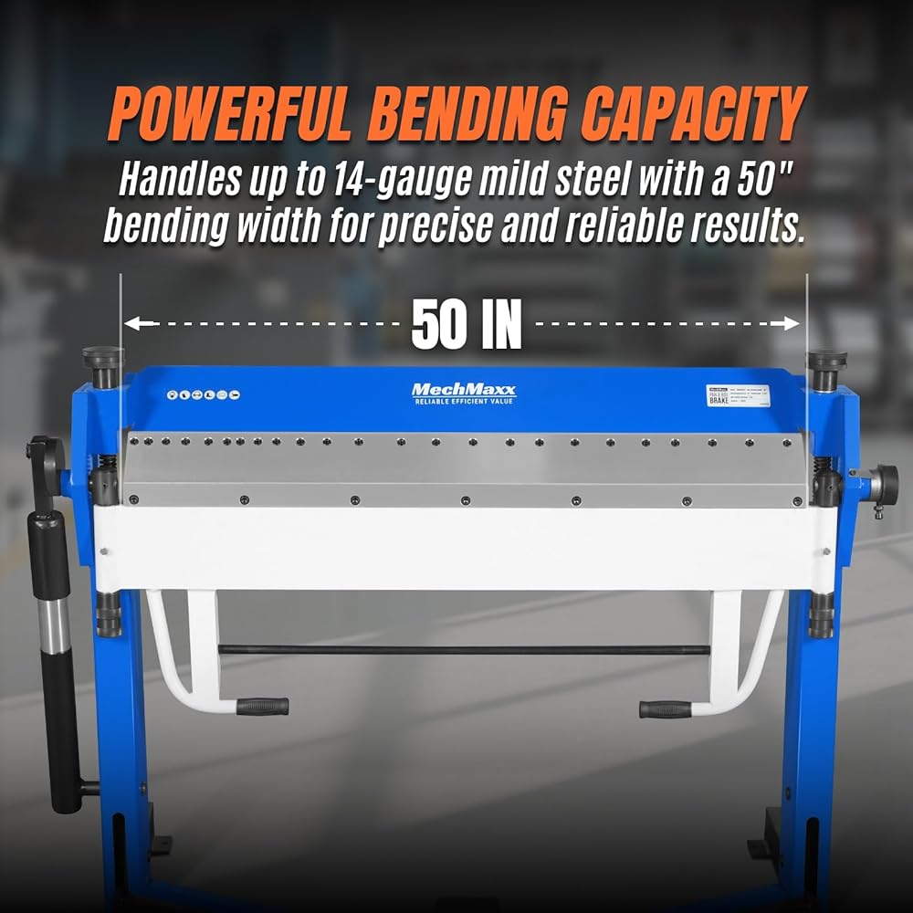 Mechmaxx 50 بوصة بمشبك القدم ومكابح الصندوق، آلة طي الصفائح المعدنية الخفيفة، زاوية الانحناء 0–135 درجة، رفع التثبيت 1.9 بوصة، عمق الصندوق 2 بوصة، الموديل PBA5014