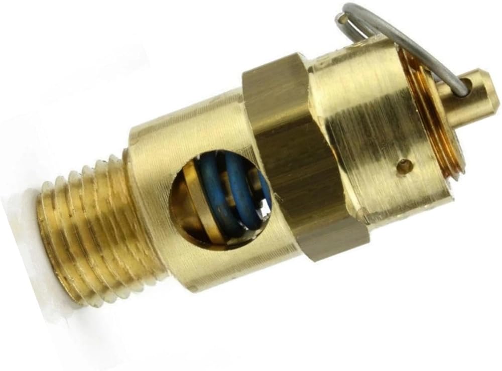 • 1/4" male NPT 70 PSI Industrial air compressor/tank pressure safety relief valve. Also known as a "Pop Off" or "Blow Off" valve. The relief pressure of this valve is set at 70 PSI and is accurate within + or - 3% of the set pressure. Specifications: This valve will relieve 67 SCFM Valve Inlet Threads: 1/4" Male NPT (measure about 1/2" in diameter) Total Valve Length: 1-3/4" Installation Wrench Size: 11/16" Features a silicone rubber soft seat relief valve to prevent leaks Max temperature: 250° F Solid Brass Construction