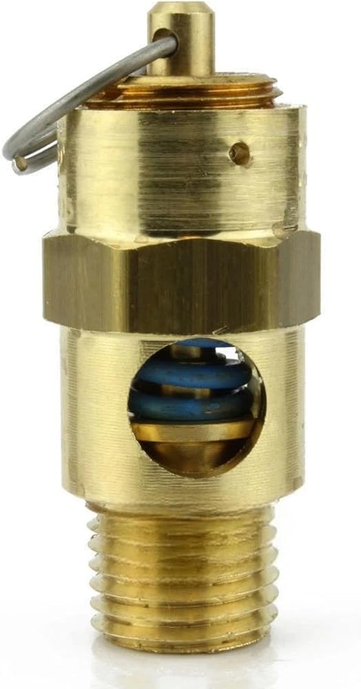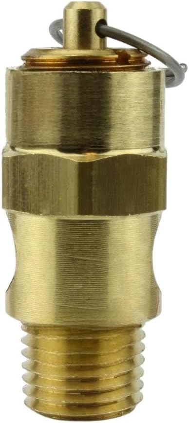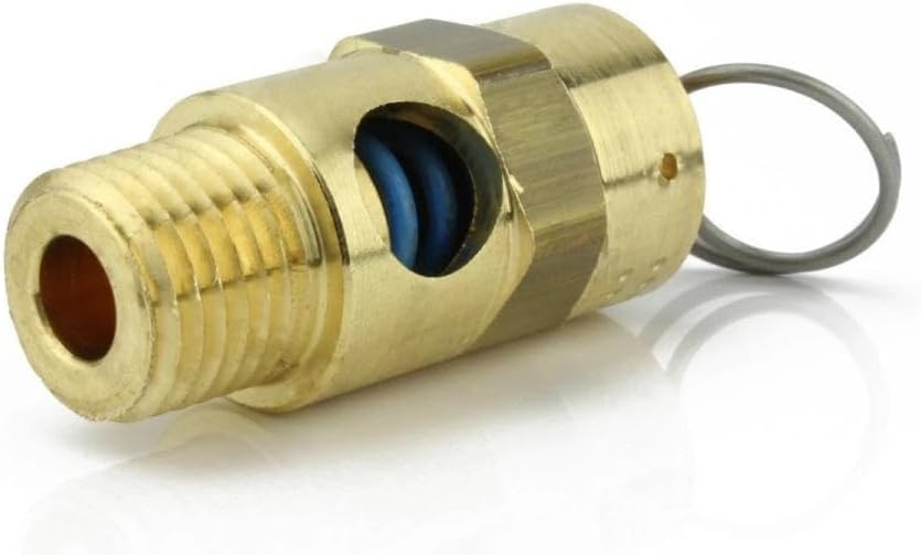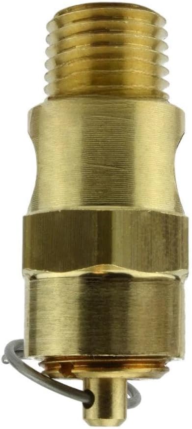 • 1/4" male NPT 125 PSI Industrial air compressor / tank pressure safety relief valve. Also known as a "Pop Off" or "Blow Off" valve. The relief pressure of this valve is set at 125 PSI and is accurate within + or - 3% of the set pressure. Specifications: This valve will relieve 112 SCFM Valve Inlet Threads: 1/4" Male NPT (measure about 1/2" in diameter) Total Valve Length: 1-3/4" Installation Wrench Size: 11/16" Features a silicone rubber soft seat relief valve to prevent leaks Max temperature: 250° F Solid Brass Construction