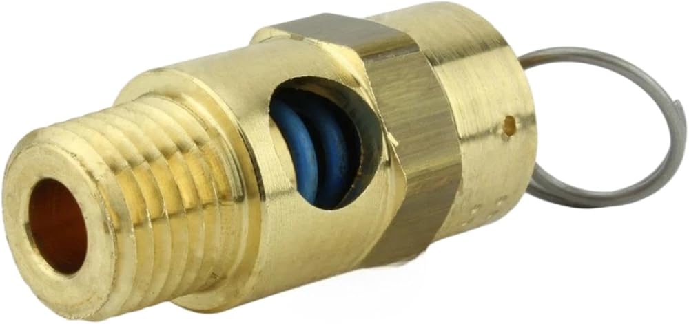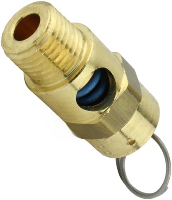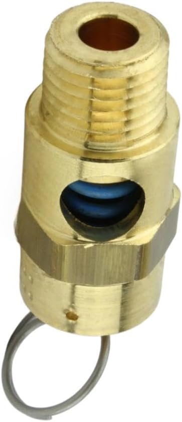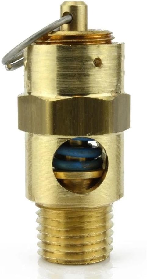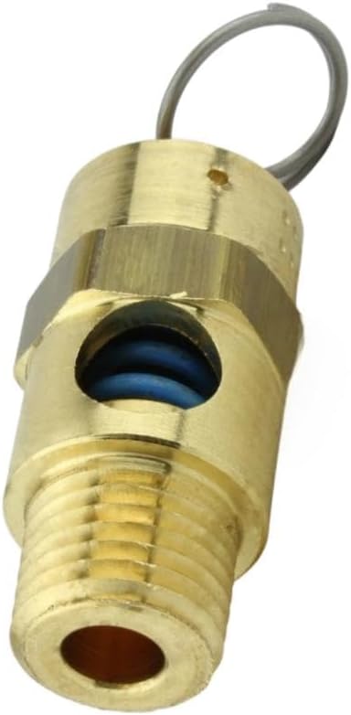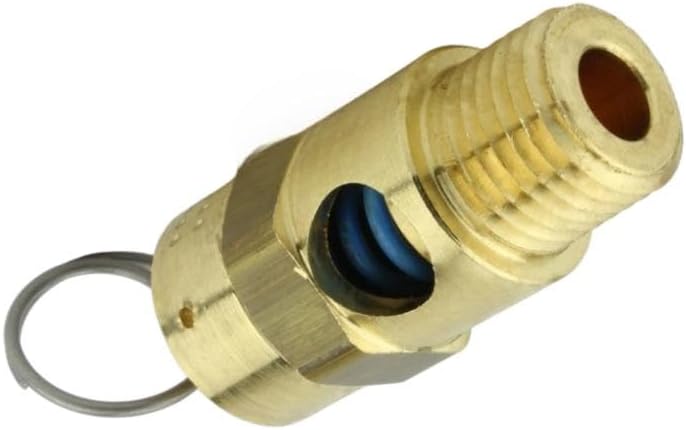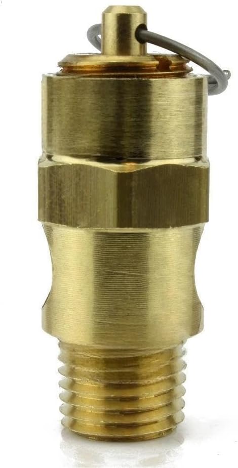 • 1/4" NPT 50 PSI Industrial air compressor / tank pressure safety relief valve. Also known as a "Pop Off" or "Blow Off" valve. The relief pressure of this valve is set at 50 PSI and is accurate within + or - 3% of the set pressure. Specifications: This valve will relieve 51 SCFM Valve Inlet Threads: 1/4" Male NPT (measure about 1/2" in diameter) Total Valve Length: 1-3/4" Installation Wrench Size: 11/16" Features a silicone rubber soft seat relief valve to prevent leaks Max temperature: 250° F Solid Brass Construction