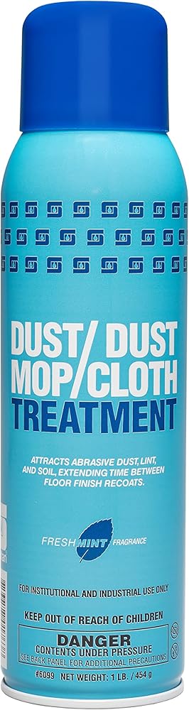 Spartan Dust Mop/Dust Cloth Treatment , 12/cs #6099 Reduces wear and the abrasion of floor finishes from sand and soil, and enhances the appearance and prolongs the floor finish life. pH 8.0 - 9.0. 20 oz. cans, Net 16 oz. Will pick up dust, lint, and soil and scattering of dust is eliminated, which reduces labor.