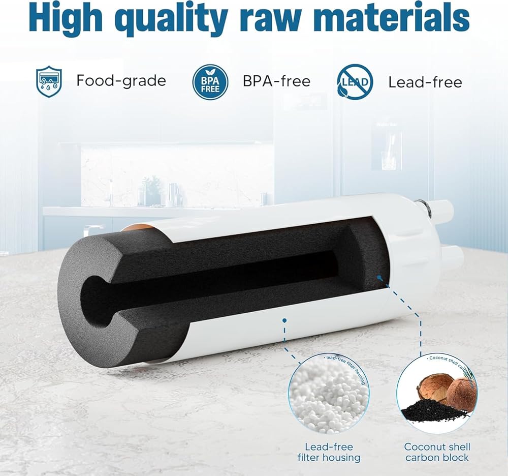 مادة فاخرة: المادة البديلة لفلتر المياه في هذا الفلتر هي كتلة كربون من قشرة جوز الهند المختارة من سريلانكا، مع مساحة سطح أكبر 2x ومسام دقيقة أكثر. يقلل بنسبة 99% من طعم ورائحة الرصاص والكلور، مما يوفر تقليلًا فائقًا للملوثات لك ولعائلتك.