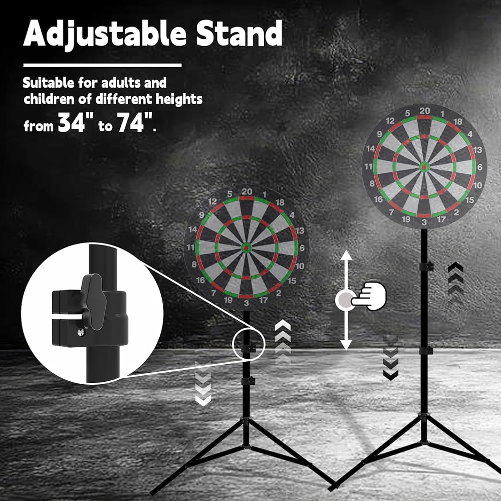 حامل لوح رمي السهام، حامل لوح رمي السهام المحمول عالي التحمل مع ارتفاع قابل للتعديل (34 بوصة إلى 74 بوصة)، حامل لوح رمي السهام للبالغين، تصميم حامل ثلاثي ثابت، سهل التجميع للسفر، في الهواء الطلق، ألعاب المنزل والبار