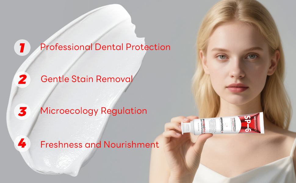تبييض آمن وفعال: يمكن لمعجون الأسنان SP-6 الخاص بنا تبييض الأسنان مع تقوية المينا. على عكس علاجات التبييض القاسية، هذه التركيبة لطيفة على الأسنان الحساسة، مما يجعلها مثالية للاستخدام اليومي دون التسبب في تهيج.