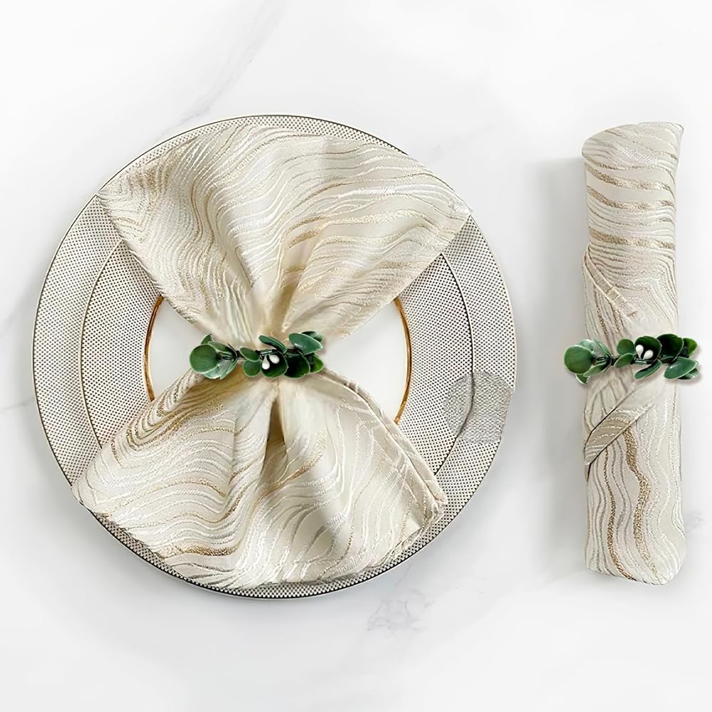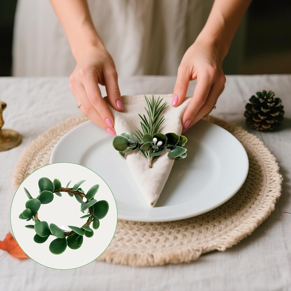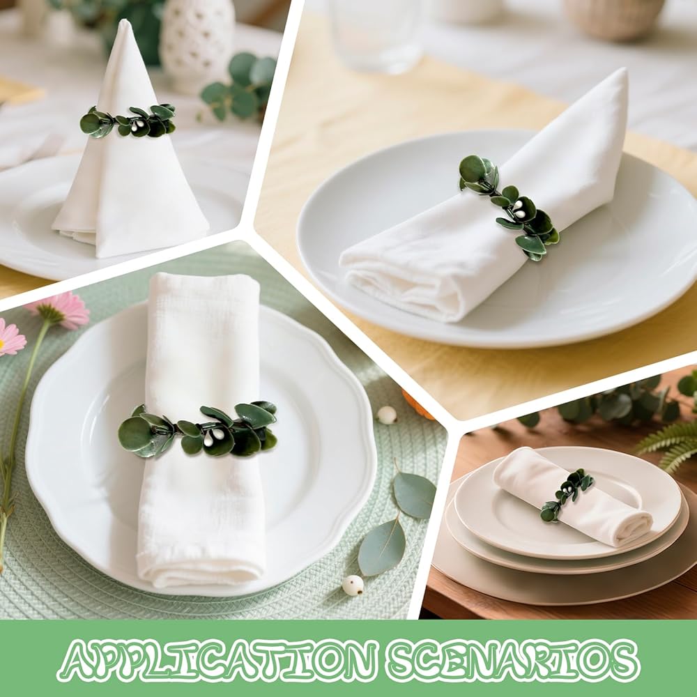 VERSATILE DECOR APPLICATIONS: Perfect for weddings, Christmas banquets, family dinners, Valentine's Day, Easter, and everyday table settings, these artificial rustic eucalyptus leaf napkin rings add a farmhouse charm to any occasion, enhancing your dining ambiance.